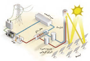 آینه ها پرتو های خورشید را روی برج گیرنده متمرکز می کنند.