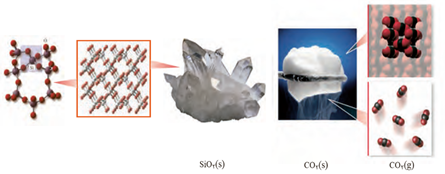 كه مواد مولكولی در ساختار خود مولكول های مجزا دارند و کربن دی اکسید از مواد مولکولی محسوب می شود، در حالی که ماده كووالانسی مجموعه ای از اتم های بسیاری است كه با هم پیوندهای اشتراكی دارند ساختاری که دلیلی بر سختی بالا و دیرگداز بودن چنین موادی است. از آنجا که این مواد در دما و فشار اتاق به حالت جامد هستند، آنها را با نام جامد کووالانسی نیز می خوانند. که عنصرهای اصلی سازندۀ جامدهای کووالانسی در طبیعت، کربن و سیلیسیم هستند و سیلیس، شامل شمار بسیار زیادی از اتم های سیلیسیم و اکسیژن با پیوندهای اشتراکی Si-O-Si بوده و دارای ساختاری به هم پیوسته و غول آساست و جامد کووالانسی محسوب می شود.