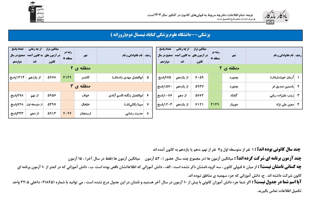یادگار ماندگار : قبولی های کانونی دانشگاه علوم پزشکی گناباد در همه رشته ها در سال 1403 را در ادامه مشاهده کنید.فایل با کیفیت قبولی های سال 1403 را در قسمت فایل های ضمیمه دانلود کنید.