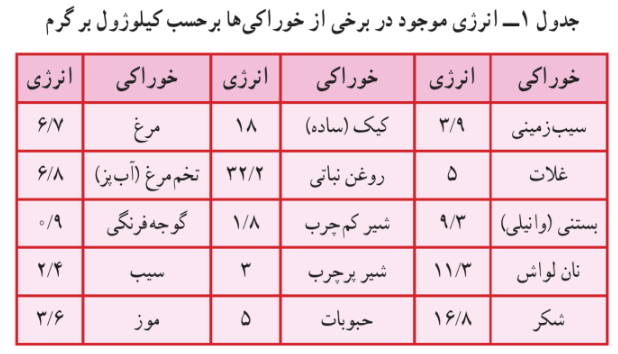 نکته: معمولاً انرژی موجود در خوراکی های بسته بندی شده را بر حسب کیلوکالری می نویسند هر کیلوکالری معادل ۴۲۰۰ ژول است. به این ترتیب داریم :