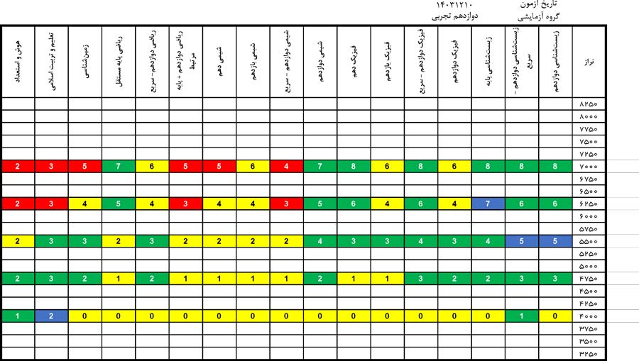 در این جدول برای هر درس رنگ های متفاوتی را می بینید .ممکن است یک درس برای یک بازه ی تراز دشوار و برای بازه ی تراز دیگر متعادل یا ساده باشد . ابتدا نمره ی تراز خود را در نظر بگیرید و سپس رنگ های هر درس را در بازه ی تراز خود ببینید . متوجه می شوید که آیا آن درس برای شما ساده تر از حد انتظار یا دشوارتر بوده یا این که متعادل بوده است .