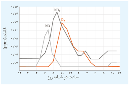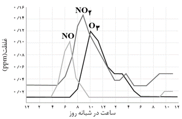 از ساعت 12 شب تا 4 صبح به دلیل کم بودن تردد خودرو ها مقدار سه آلاینده تقریبا ثابت است، از ساعت 4 با ورود خودرو ها و انجام واکنش N2+O2→2NO غلظت NO افزایش می یابد. سپس واکنش2NO2→ 2NO2+O2 انجام می شود و غلظت NO2 از ساعت 5 شروع به افزایش می کند و ساعت 9 به بیشترین حد خود می رسد. با قدرت گرفتن نور خورشید از ساعت7 واکنش NO2+O2→O3+NO به میزان بیشتری انجام می شود و غلظت O3 افزایش می یابد و حدود ساعت 10 به بیشترین مقدار خود می رسد.