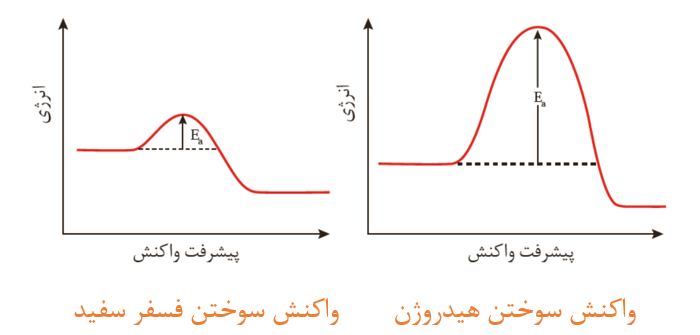 فسفر سفید برخلاف گاز هیدروژن در هوا و در دمای اتاق می سوزد. این موضوع نشان می دهد که انرژی فعال سازی واکنش سوختن فسفر سفید از انرژی فعال سازی واکنش سوختن گاز هیدروژن کم تر است.