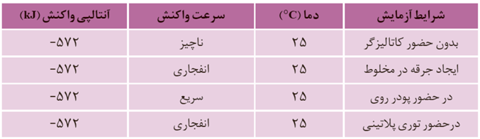 این واکنش در دمای اتاق بدون حضور کاتالیزگر انجام نمی شود چون انرژی فعال سازی آن زیاد است و در دمای اتاق تامین نمی شود.