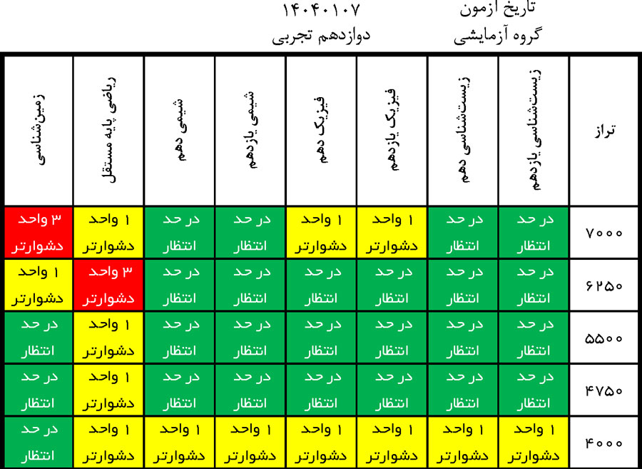 در این جدول برای هر درس رنگ های متفاوتی را می بینید .ممکن است یک درس برای یک بازه ی تراز دشوار و برای بازه ی تراز دیگر متعادل یا ساده باشد . ابتدا نمره ی تراز خود را در نظر بگیرید و سپس رنگ های هر درس را در بازه ی تراز خود ببینید . متوجه می شوید که آیا آن درس برای شما ساده تر از حد انتظار یا دشوارتر بوده یا این که متعادل بوده است .