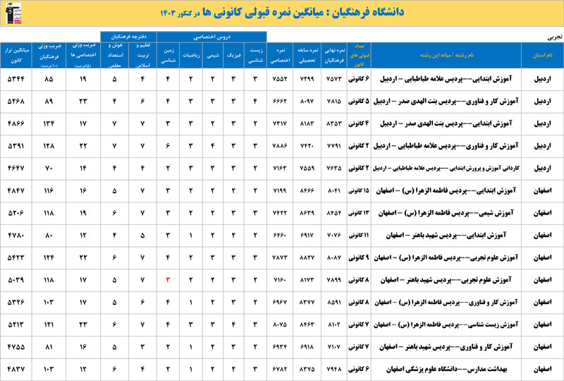 دانشگاه فرهنگیان : میانگین نمره قبولی کانونی ها در کنکور 1403