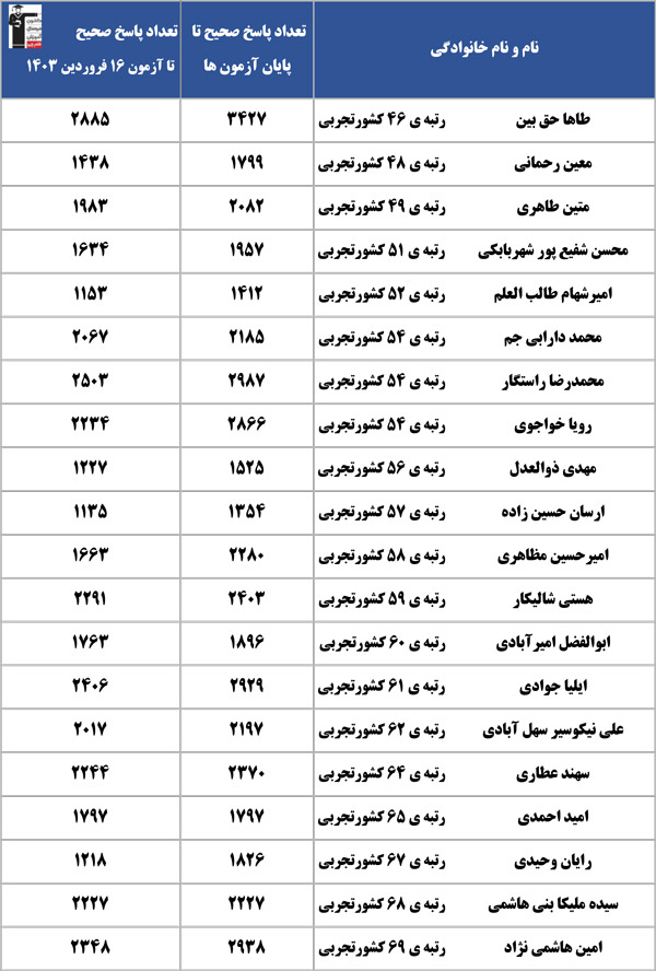 توجه کنید که این آمار مربوط به پاسخ های صحیح در آزمون های کانون تا آخرین آزمون (9 تیر 1403) پارسال بود
