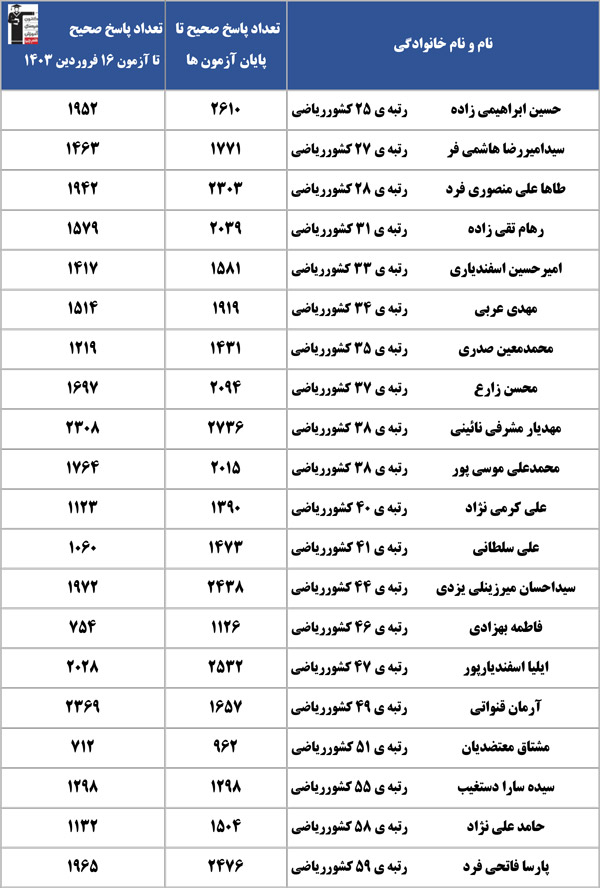 توجه کنید که این آمار مربوط به پاسخ های صحیح در آزمون های کانون تا آخرین آزمون (9 تیر 1403) پارسال بود