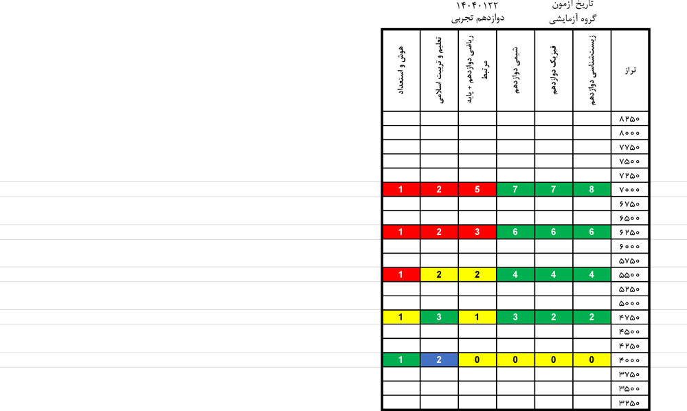 در این جدول برای هر درس رنگ های متفاوتی را می بینید .ممکن است یک درس برای یک بازه ی تراز دشوار و برای بازه ی تراز دیگر متعادل یا ساده باشد . ابتدا نمره ی تراز خود را در نظر بگیرید و سپس رنگ های هر درس را در بازه ی تراز خود ببینید . متوجه می شوید که آیا آن درس برای شما ساده تر از حد انتظار یا دشوارتر بوده یا این که متعادل بوده است .