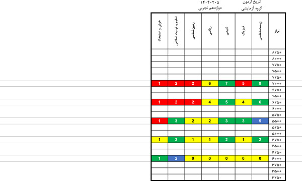 در این جدول برای هر درس رنگ های متفاوتی را می بینید .ممکن است یک درس برای یک بازه ی تراز دشوار و برای بازه ی تراز دیگر متعادل یا ساده باشد . ابتدا نمره ی تراز خود را در نظر بگیرید و سپس رنگ های هر درس را در بازه ی تراز خود ببینید . متوجه می شوید که آیا آن درس برای شما ساده تر از حد انتظار یا دشوارتر بوده یا این که متعادل بوده است .