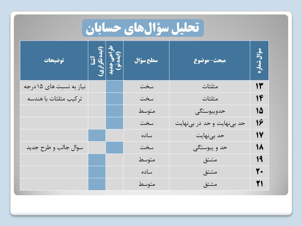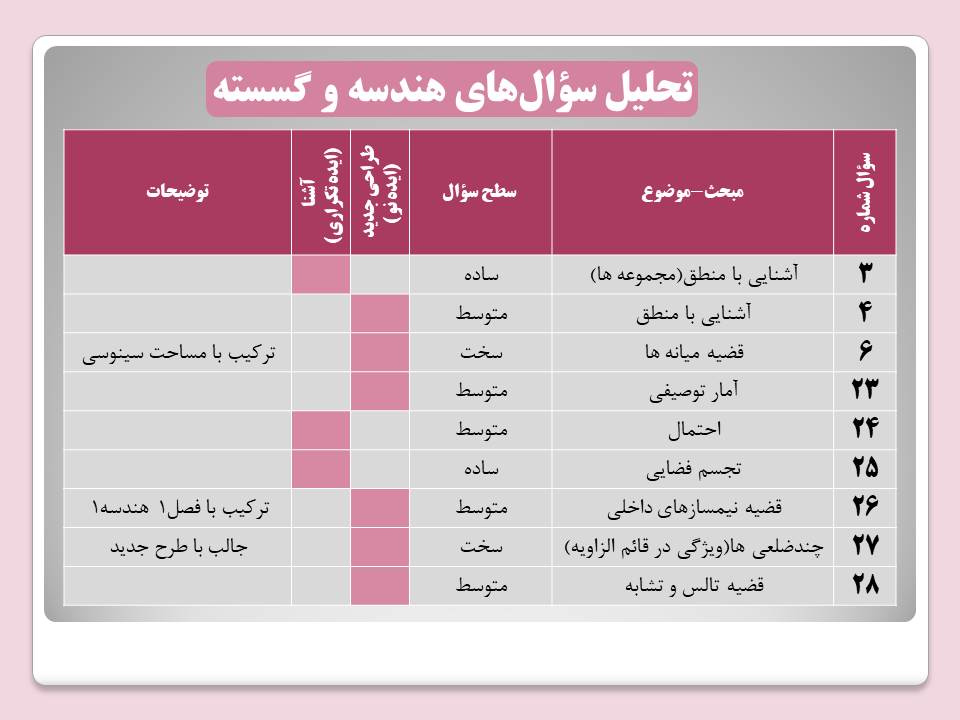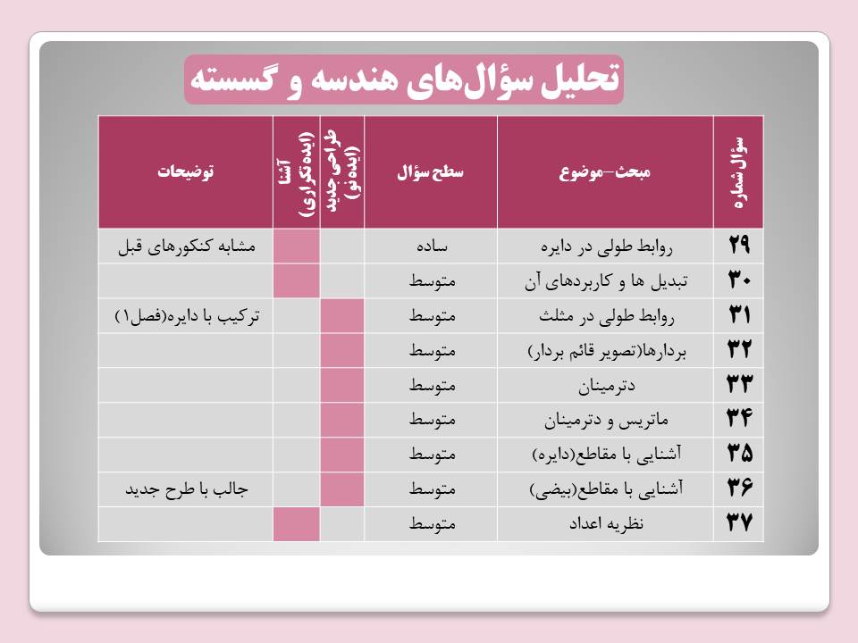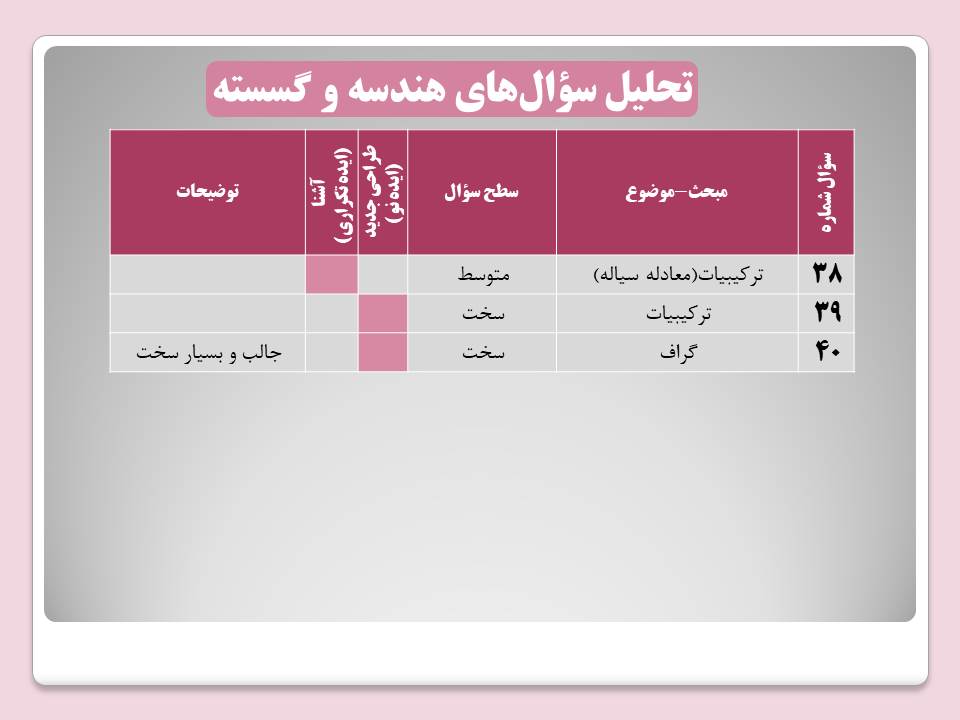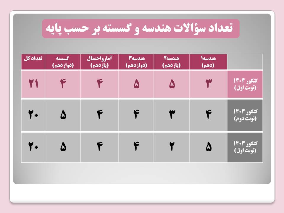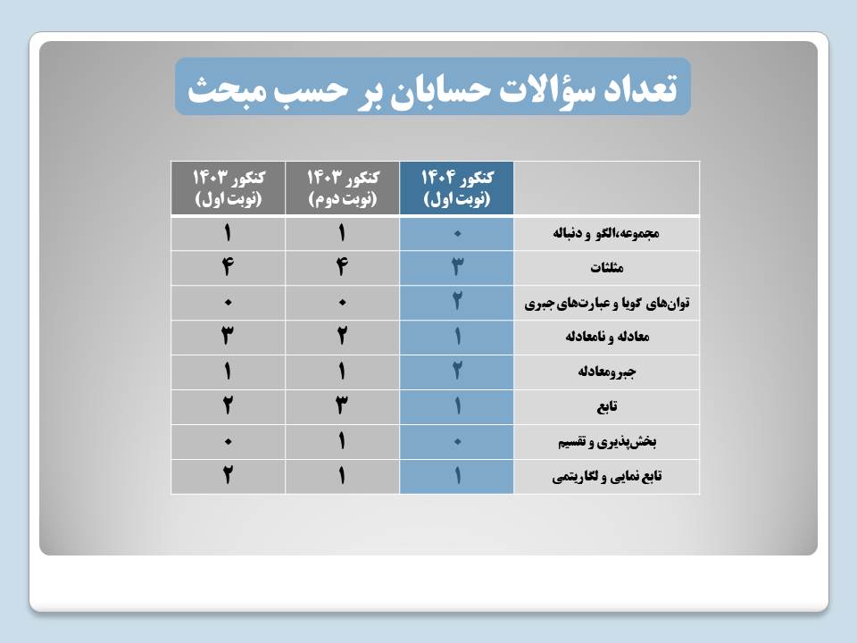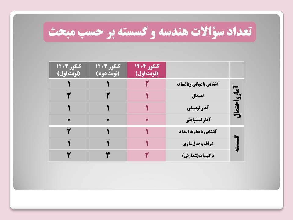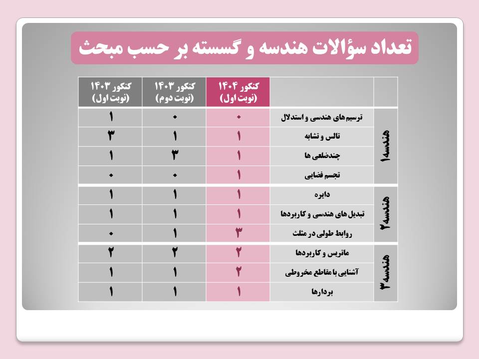 در تصاویر زیر رویکردهای 4 درس حسابان، هندسه و گسسته، فیزیک و شیمی را در کنکور ریاضی اردیبهشت 1404 (نوبت اول) و همچنین مقایسه آن با کنکور سال گذشته 1403 در دو نوبت اول و دوم را آورده ایم.