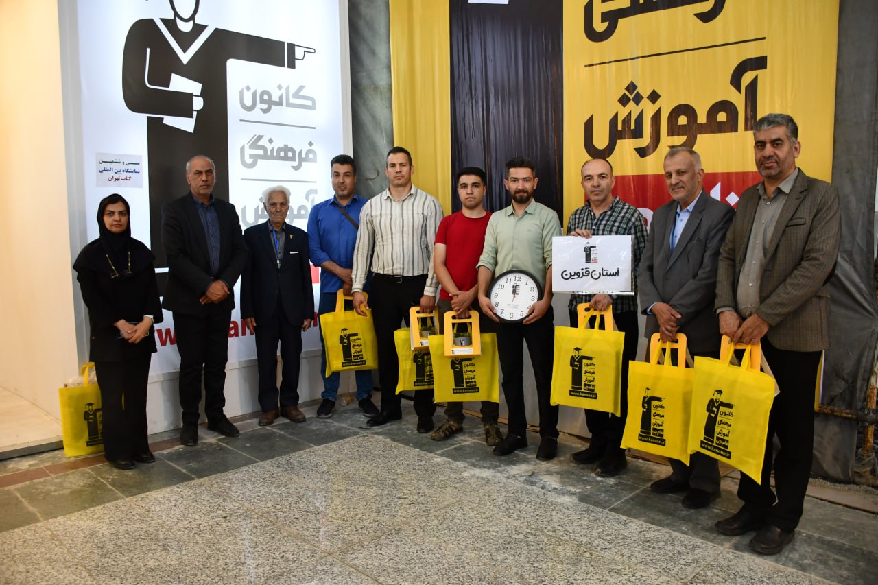 اهدای کتاب به کتابخانه های استان قزوین (حسین سرمه، رمضانعلی محسنی و مریم صدیقی در کنار مسئولان و کتابداران کتابخانه ها)