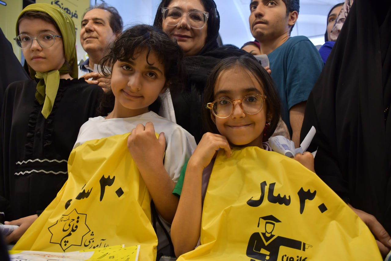 دانش آموز به همراه مادر پس از دریافت کتاب و هدایا از غرفه کانون