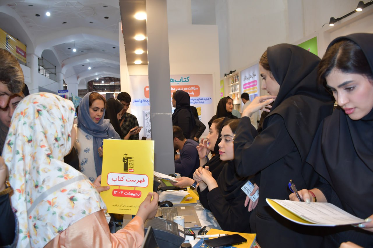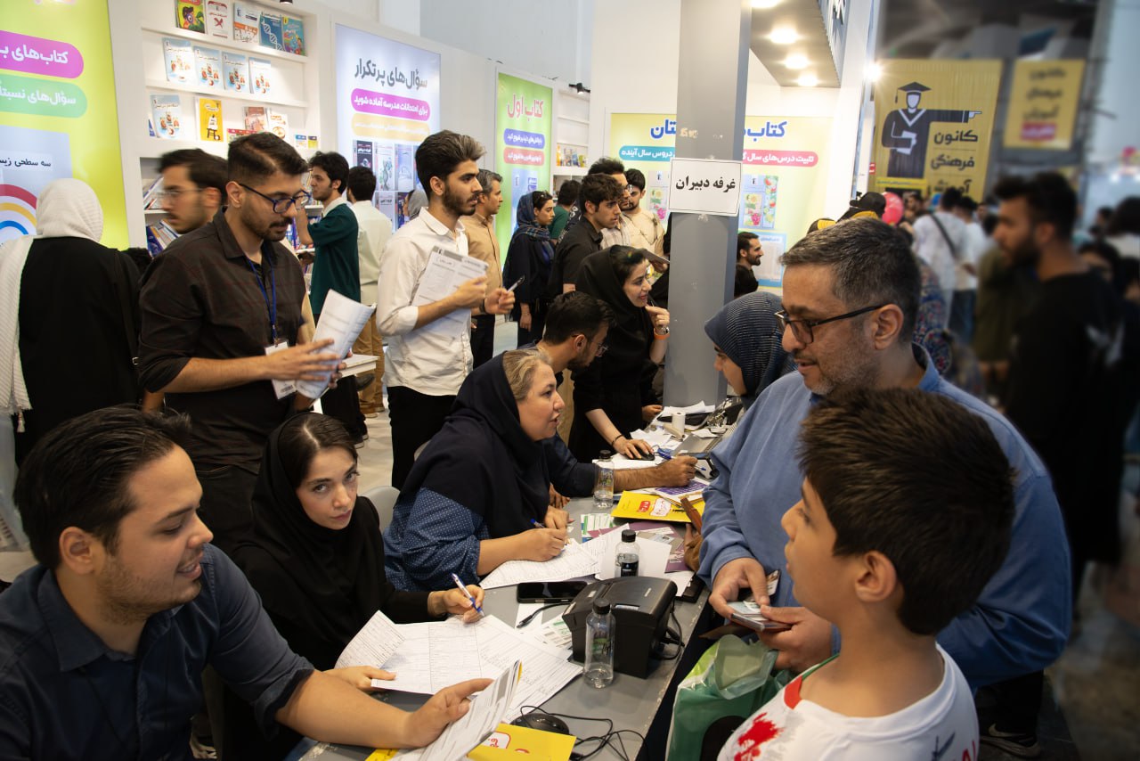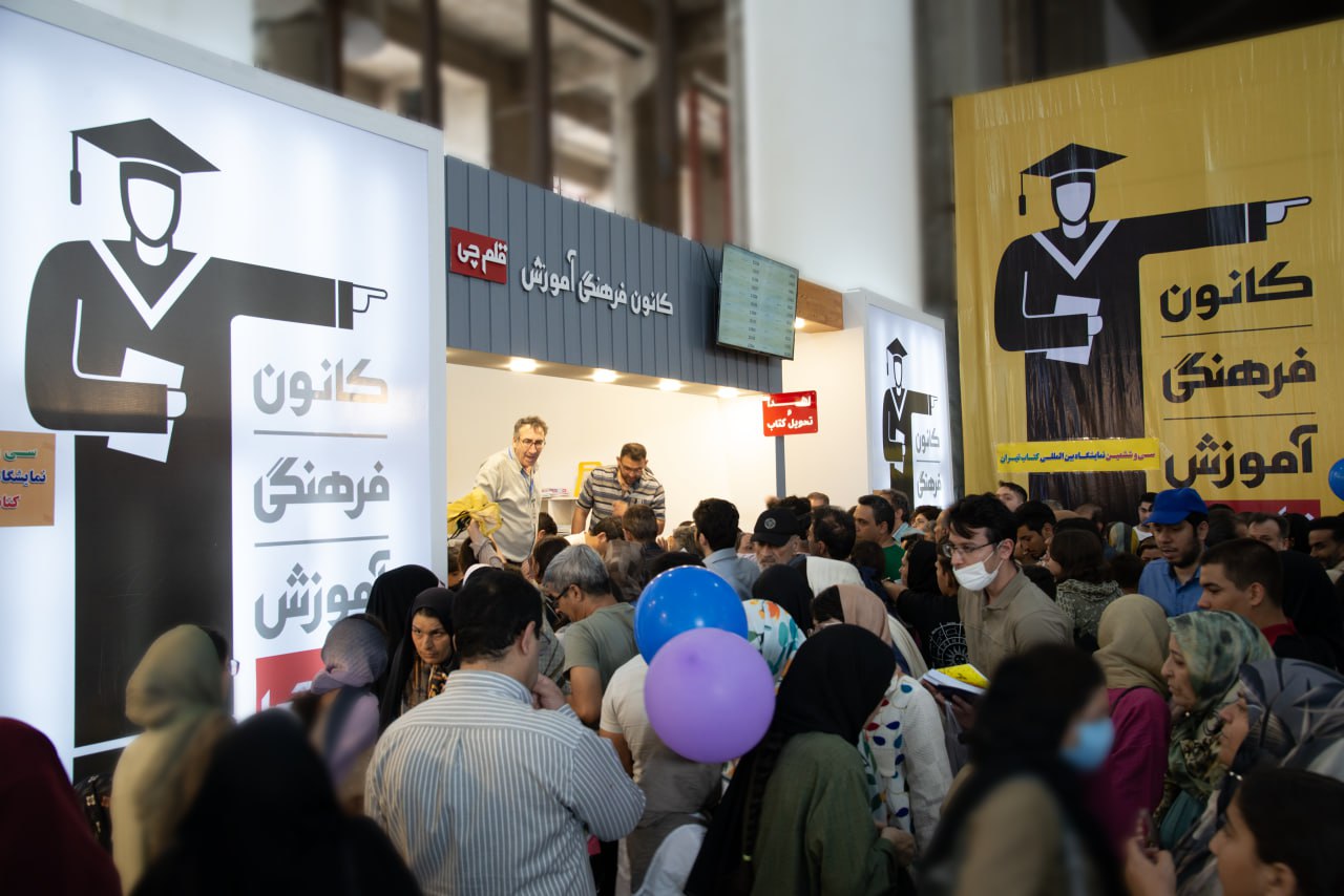مراجعه معلمان به بخش مدارس غرفه کانون در نمایشگاه برای دریافت کتاب و مشاوره