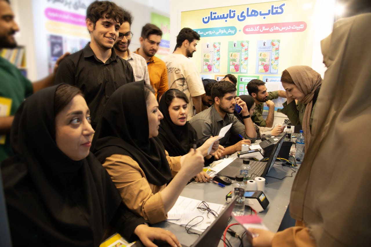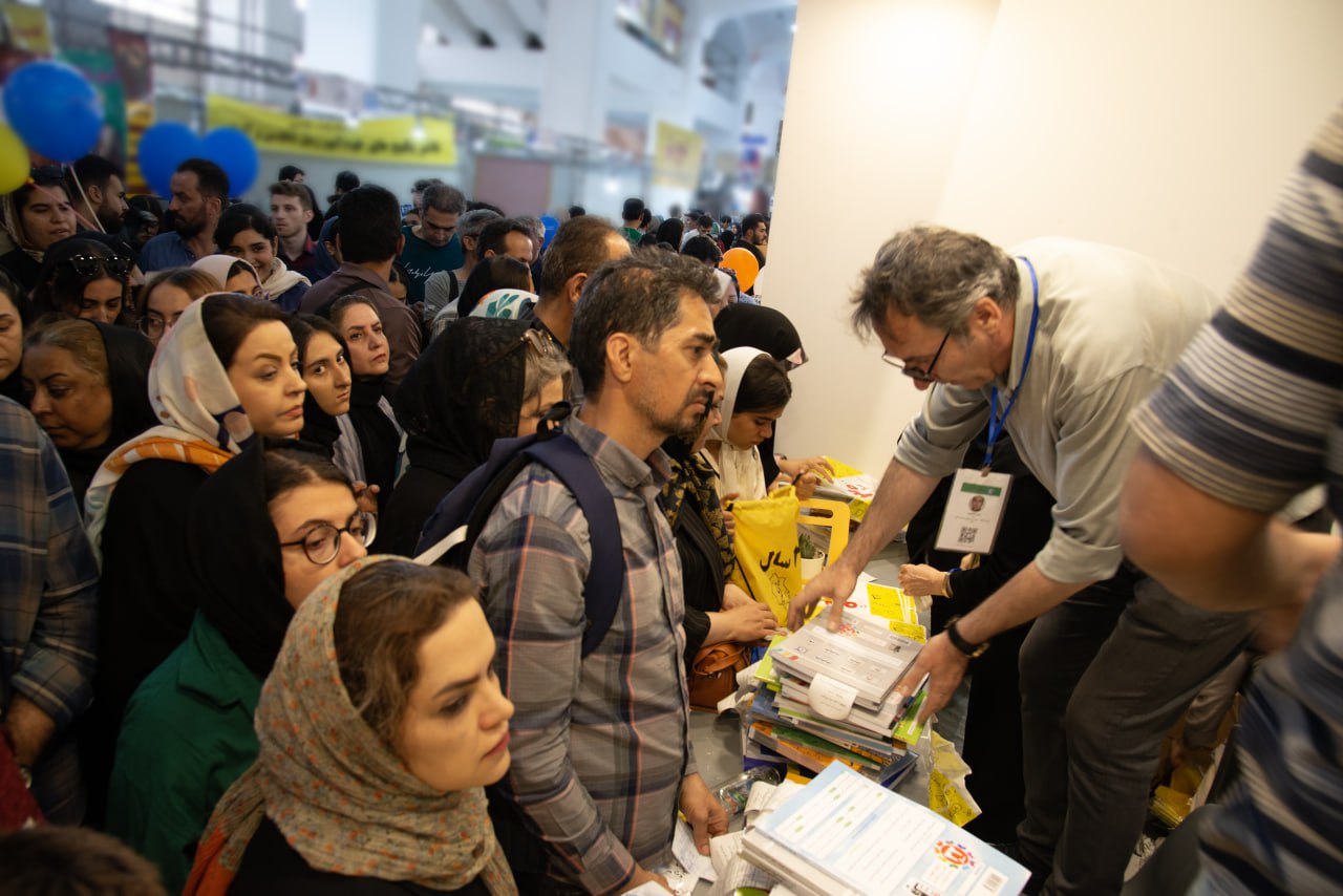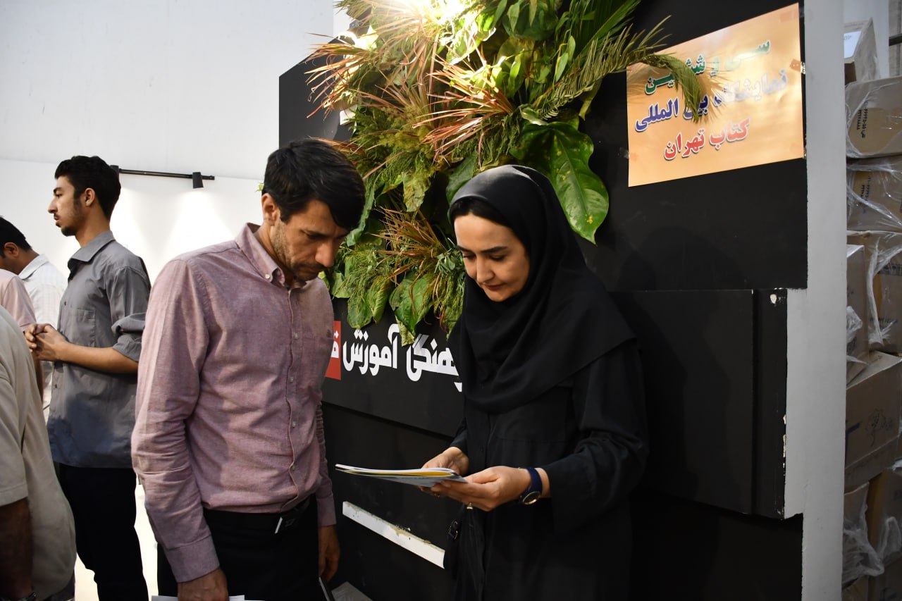 مراجعه معلمان به بخش مدارس غرفه کانون در نمایشگاه برای دریافت کتاب و مشاوره