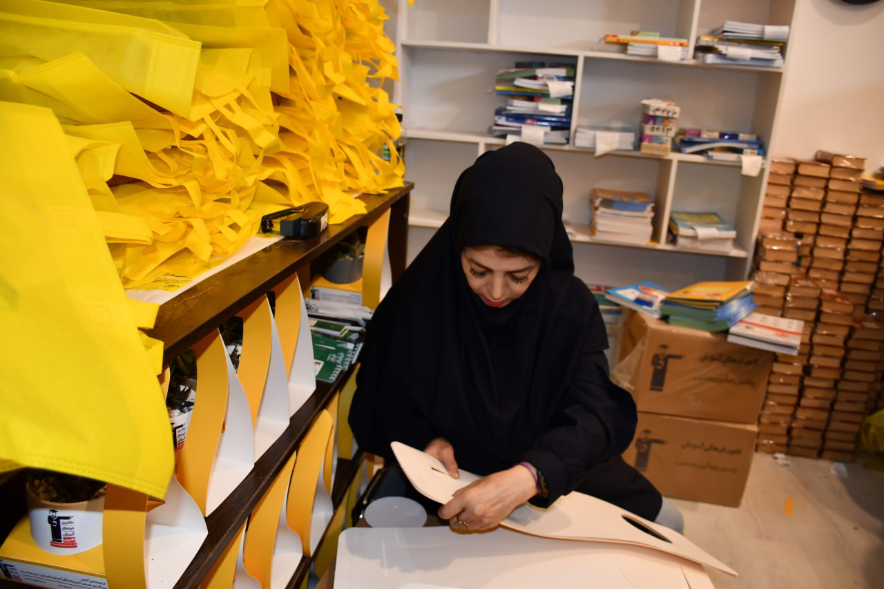 سعیده صالحی از همکاران گروه پیام کانون، در بخش اهدا در غرفه کانون در حال آماده سازی هدایا