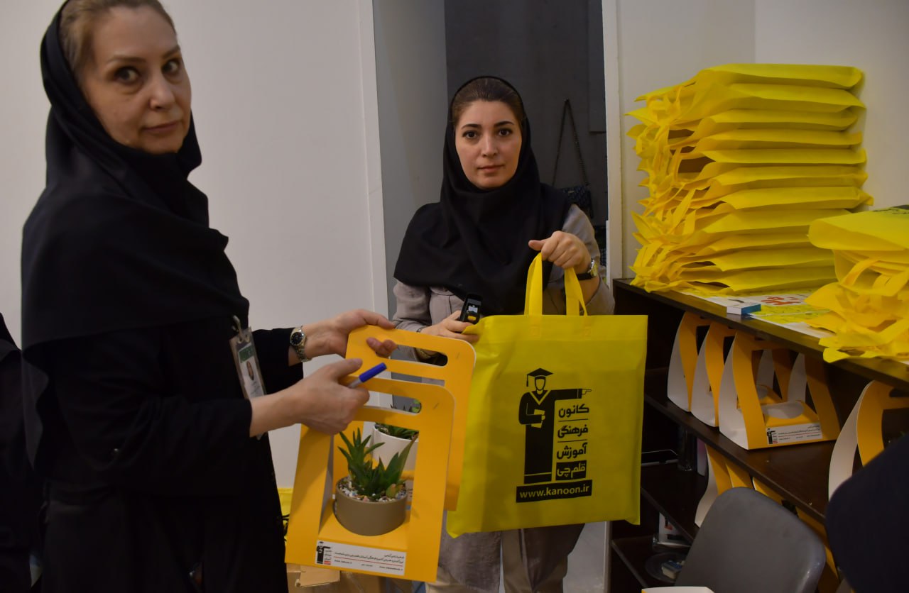 ویدا نادری و رخسانا اشک تراب در بخش اهدای هدایای کانون مشغول آماده سازی گلدان ها و ساعت های اهدایی کانون به دانش آموزان