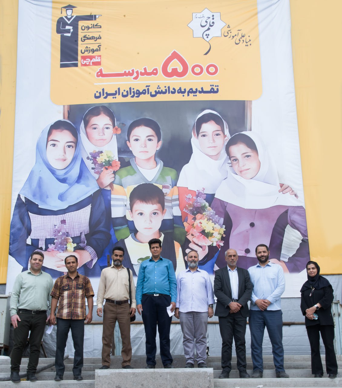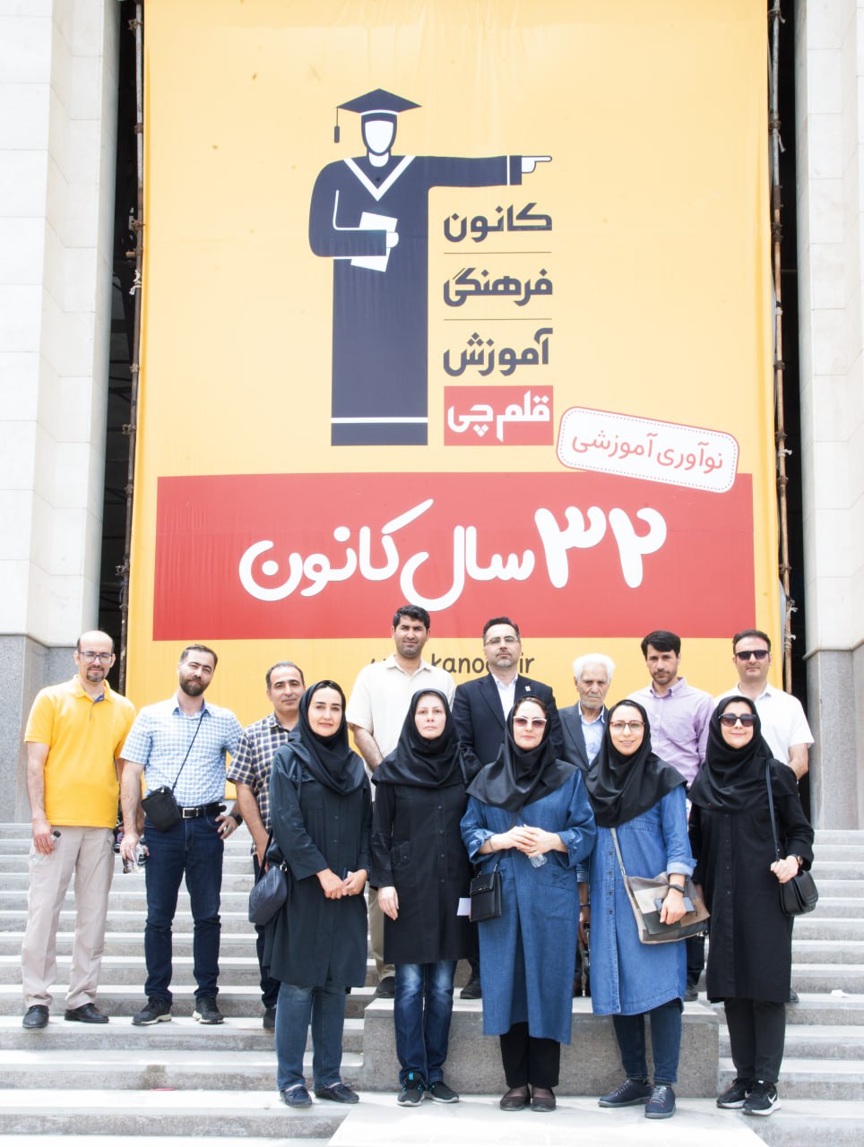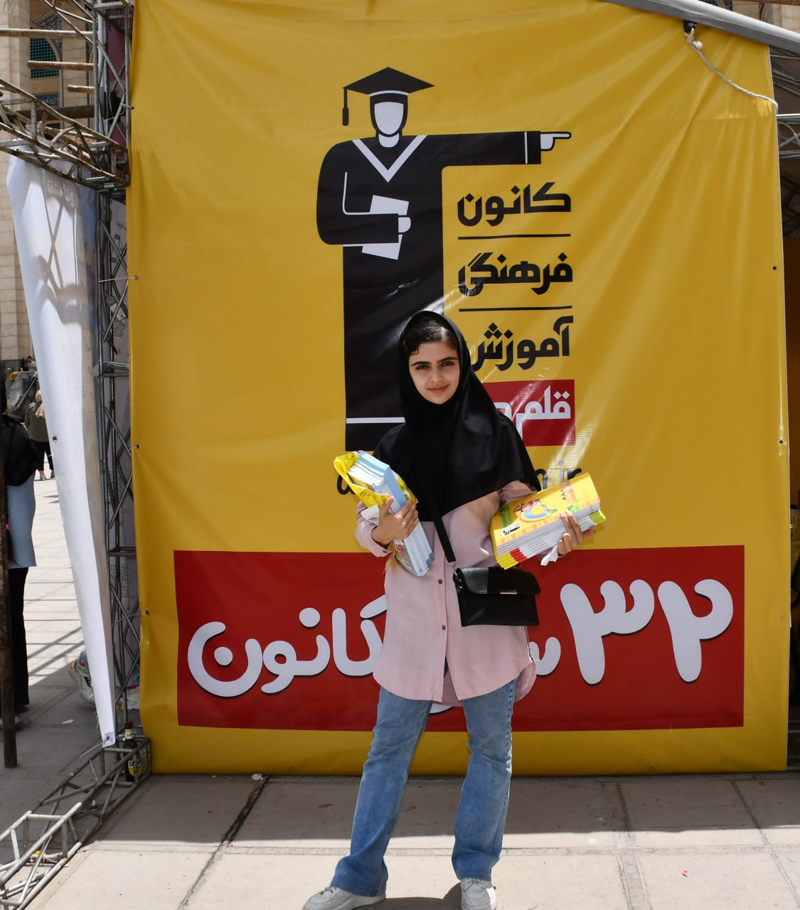 عکس یادگاری دانش آموز پس از دریافت کتاب های کانون با تابلوی 32 سال کانون فرهنگی آموزش (قلم چی)