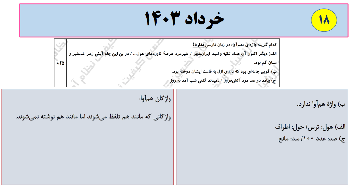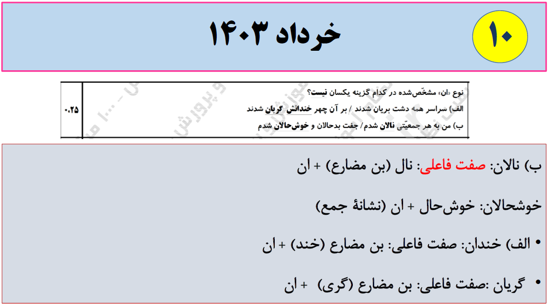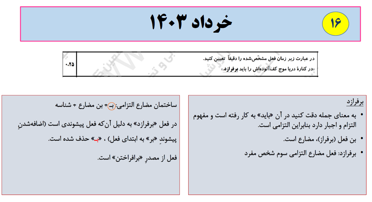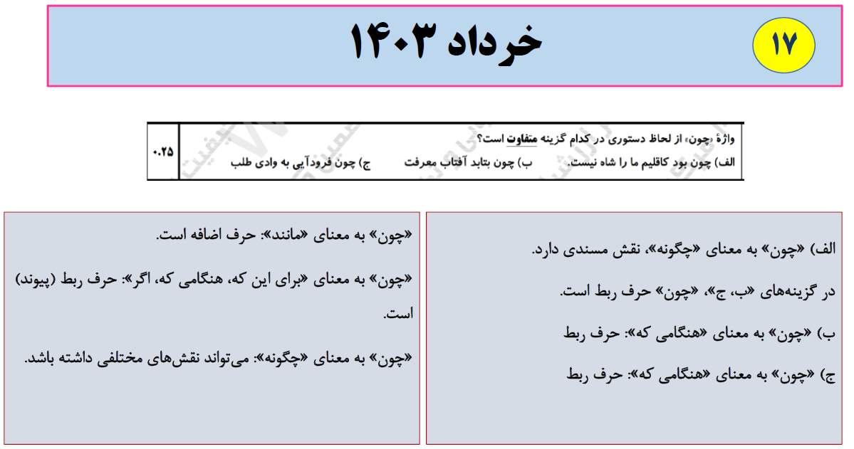 در این مطلب علاوه بر نکات مباحث دستوری فارسی 3 در امتحان نهایی 1403 مطرح شده به تمام سؤالات نیز پاسخ داده شده است.