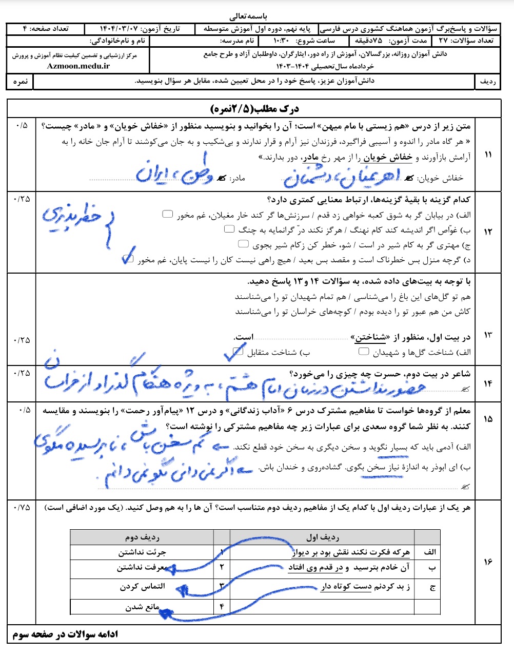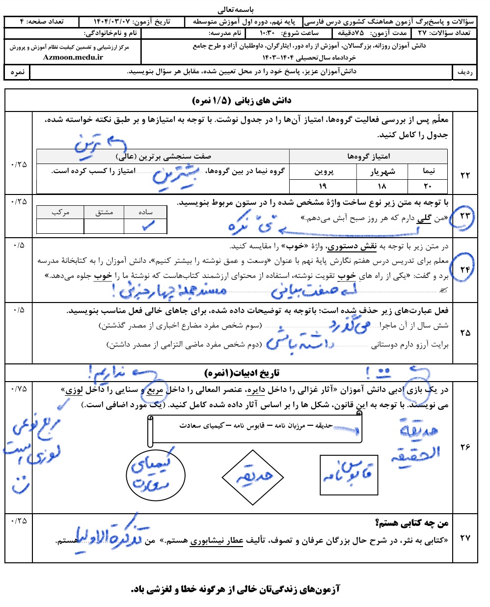درقسمت فایل های ضمیمه می توانید راهنمای تصحیح منتشر شده توسط آموزش و پرورش را نیز مشاهده کنید.