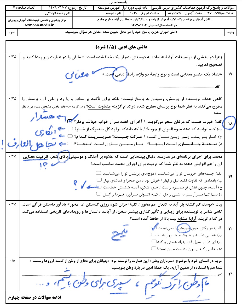 نکتهی مهم: در پاسخ رسمی مرکز ارزشیابی، در سؤال نوزده، ذکر شده است که منظور، وجود ردیف بوده و جواب الف است.
