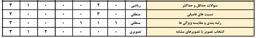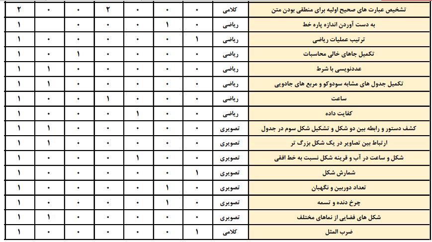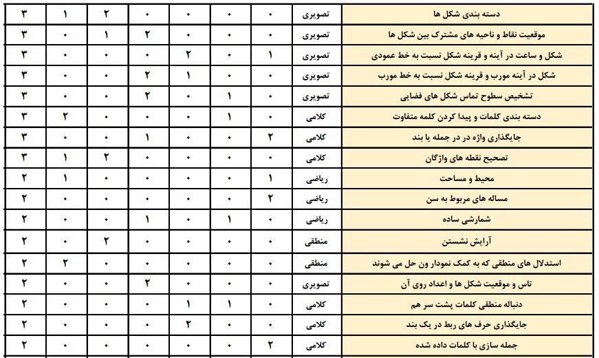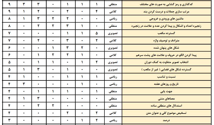 من وقتی این جدول را می بینم ، به یاد دانش آموزانی می افتم که در هر مبحث قوی هستند و یا باید در یک مبحث ، تمرین بیشتری داشته باشند . می دانم روژانو باید تمرین های بیشتری از گسترده هرم حل کند . ترنم نباید موقع پیدا کردن رابطه ی بین اعداد در شکل ها ، استرس داشته باشد . طهورا نباید موقع آزمون تیزهوشان روی سوالات حداقل و حداکثر و جدید وقت زیادی بگذارد و باید حواسش به مدیریت زمان آزمون باشد . همچنین باید موقع جواب دادن به سوالات منطقی و ریاضی به قوانین و شرایط ارائه شده ، خوب دقت کند و ....