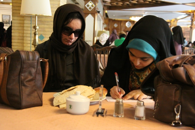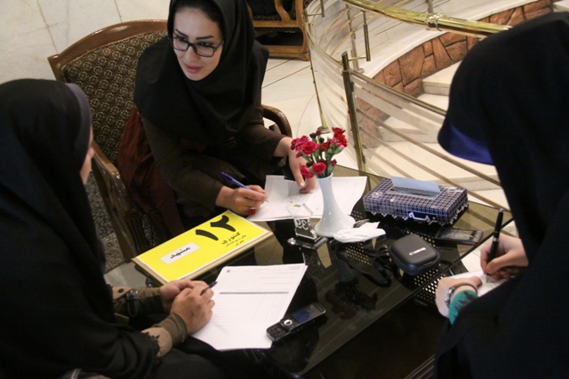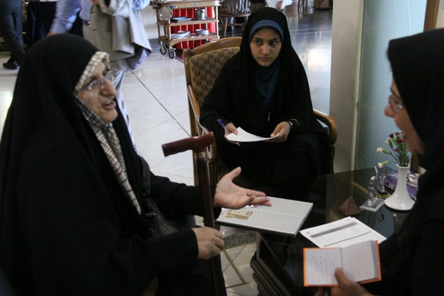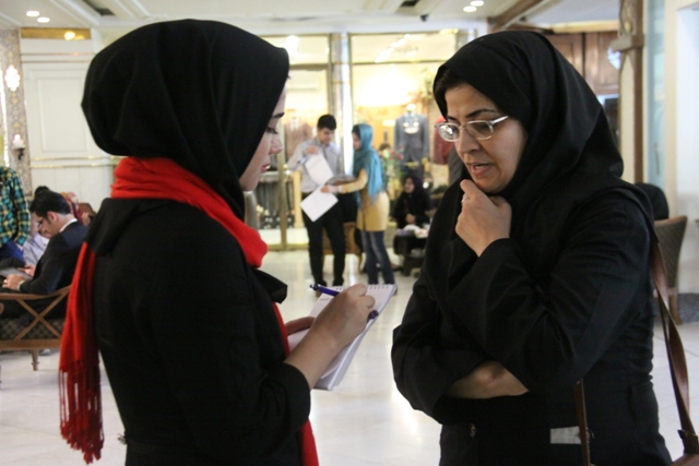 يک خبرنگار در حال مصاحبه با زهرا علومي مسئول واحد بورسيه بنياد قلم چي