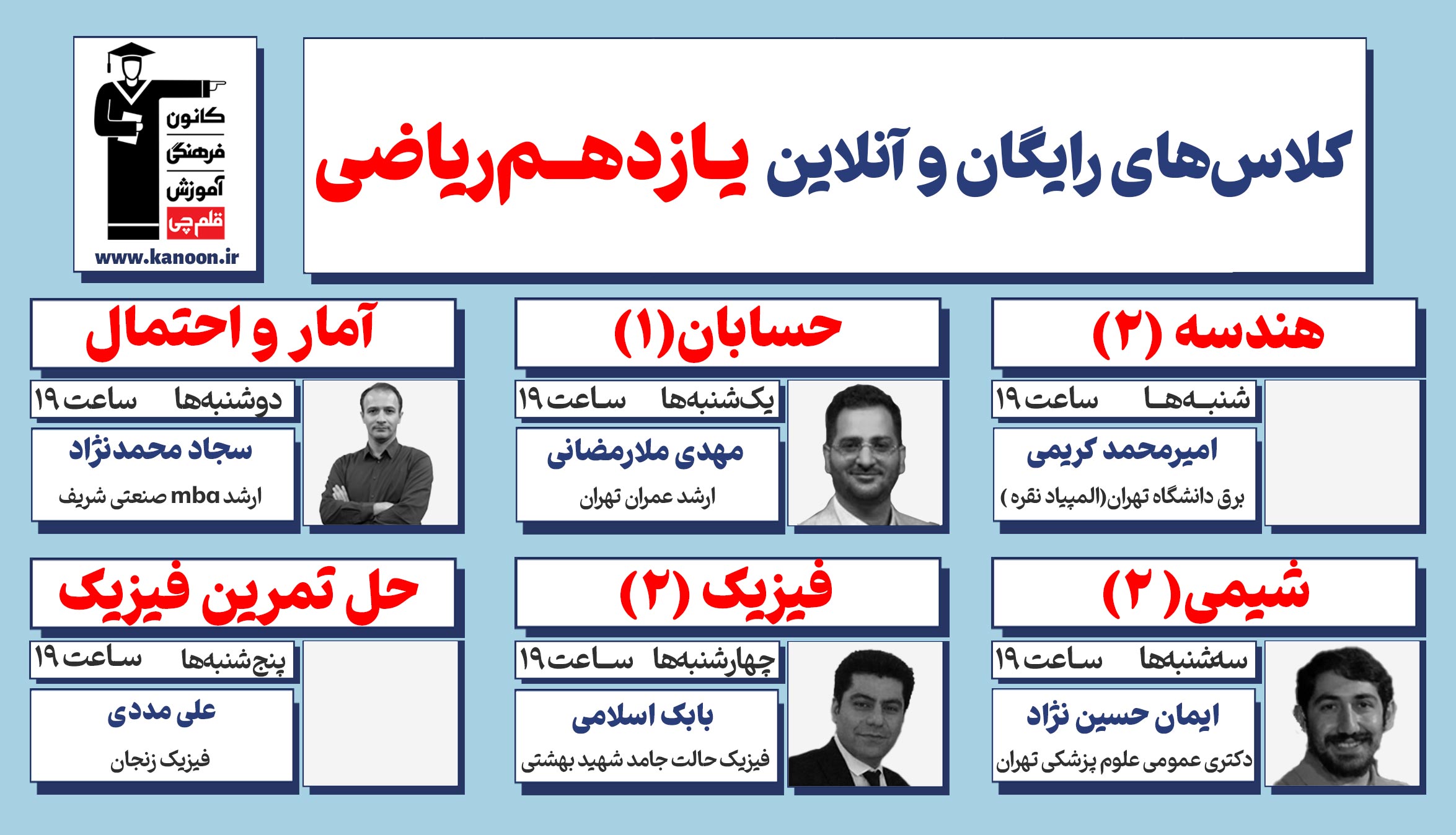 کلاسها هر هفته، رأس ساعتهای اعلامشده در جدول برگزار میگردد و مدت زمان هر جلسه یک ساعت میباشد.