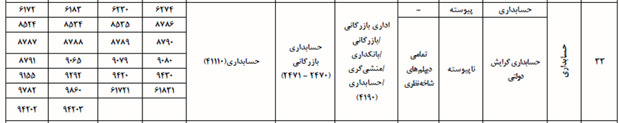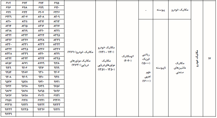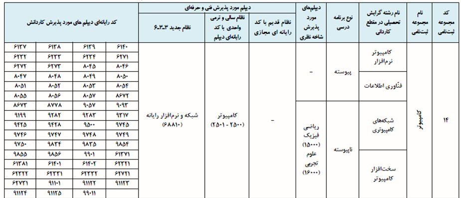 اگر شما دانش آموز کاردانش هستید، در صورتی مجاز به شرکت در آزمون یکی از رشتههای پذیرش بر اساس آزمون هستید که کد رایانهای دیپلم شما طبق جدولهای زیر باشد: