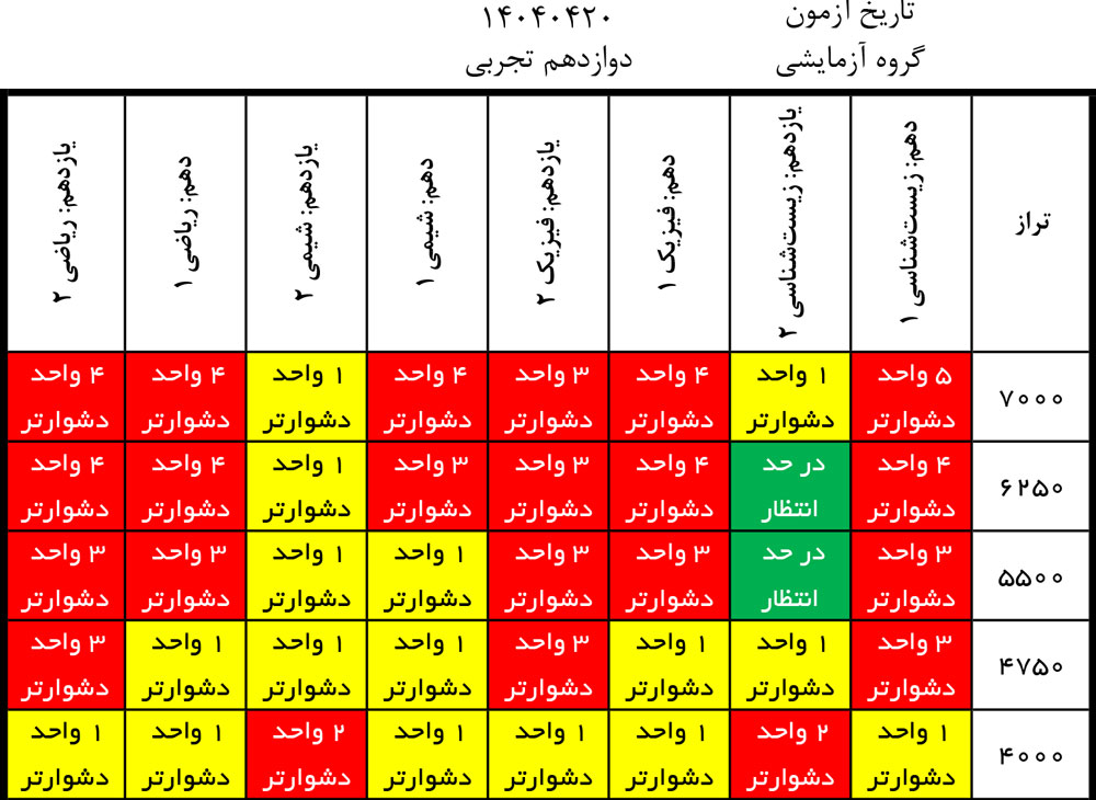 در این جدول برای هر درس رنگ های متفاوتی را می بینید .ممکن است یک درس برای یک بازه ی تراز دشوار و برای بازه ی تراز دیگر متعادل یا ساده باشد . ابتدا نمره ی تراز خود را در نظر بگیرید و سپس رنگ های هر درس را در بازه ی تراز خود ببینید . متوجه می شوید که آیا آن درس برای شما ساده تر از حد انتظار یا دشوارتر بوده یا این که متعادل بوده است .