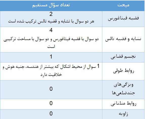 همچون کنکورهای پیشین، مبحث قضیه فیثاغورس، مساحت و محیط سهم بالایی را به خود اختصاص داده است. اما یک مبحث دیگر بسیار پرتکرارتر از سالهای گذشته مطرح شده که مبحث تشابه و قضیه تالس است و در 4 سوال باید از مفاهیم آن استفاده کرد.