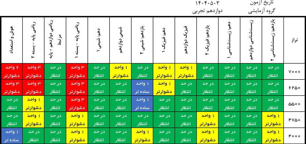 در این جدول برای هر درس رنگ های متفاوتی را می بینید .ممکن است یک درس برای یک بازه ی تراز دشوار و برای بازه ی تراز دیگر متعادل یا ساده باشد . ابتدا نمره ی تراز خود را در نظر بگیرید و سپس رنگ های هر درس را در بازه ی تراز خود ببینید . متوجه می شوید که آیا آن درس برای شما ساده تر از حد انتظار یا دشوارتر بوده یا این که متعادل بوده است .