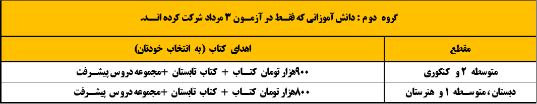 گروه اول: دانش آموزانی که در هر دو آزمون 20 تیر و3 مرداد شرکت کرده اند، بیشترین مبلغ اهدایی را به شرح زیر، دریافت می کنند: