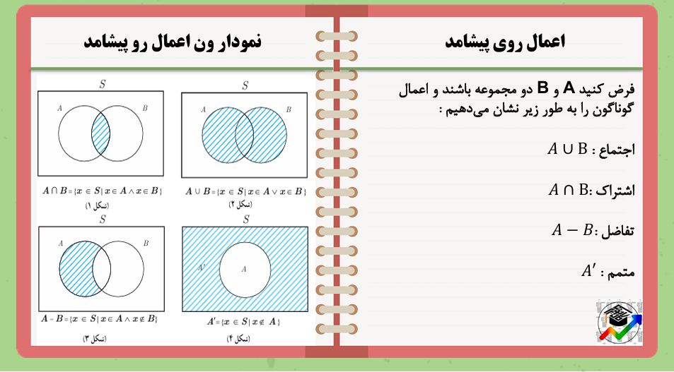 در ادامه به انواع اعمال ممکن روی پیشامد( اجتماع - اشتراک - تفاضل - متمم ) میپردازیم و خواص و نحوه عملکرد هر یک را بررسی میکنیم :