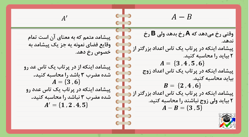 - فضای نمونه پرتاب یک تاس اعداد ۱ و ۲ و ۳ و ۴ ۵ و ۶ میباشد.