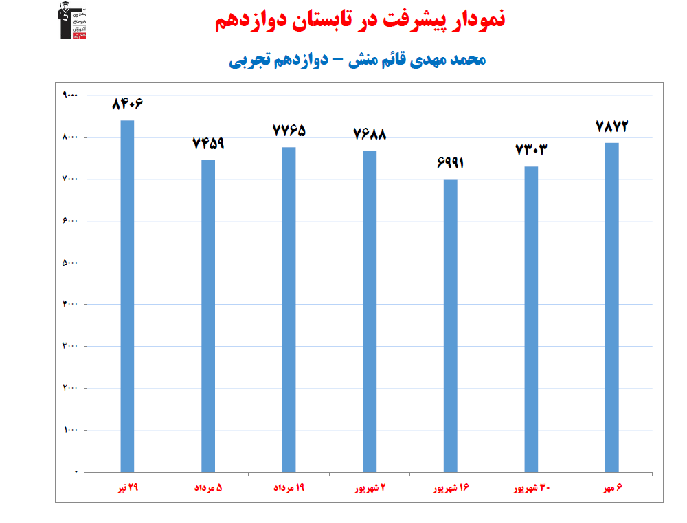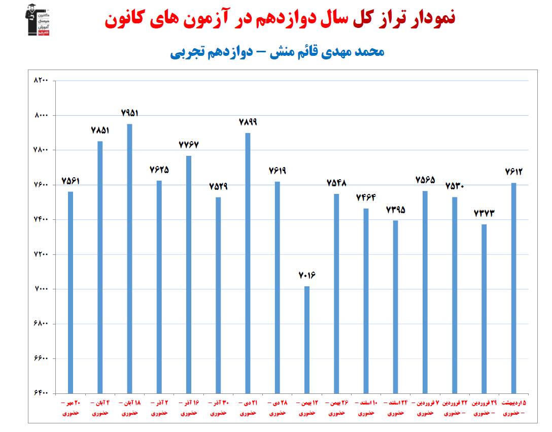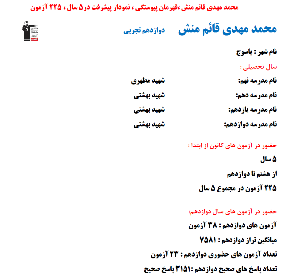در ادامه میتوانید عملکرد درسی محمدمهدي قائم منش را در کانون مشاهده کنید.نمودار پیشرفت میانگین تراز در پایههای مختلف، نمودار تراز کل، عملکرد آزمونهای سال دوازدهم و شروع از تابستان و تراز آزمون های تابستان، کارنامههای مبحثی در نمودارها و تصاویر زیر قابل مشاهده است.