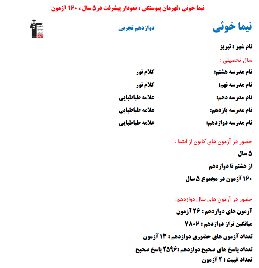در ادامه میتوانید عملکرد درسی نیما خوئی را در کانون مشاهده کنید.نمودار پیشرفت میانگین تراز در پایههای مختلف، نمودار تراز کل، عملکرد آزمونهای سال دوازدهم، کارنامههای مبحثی در نمودارها و تصاویر زیر قابل مشاهده است.