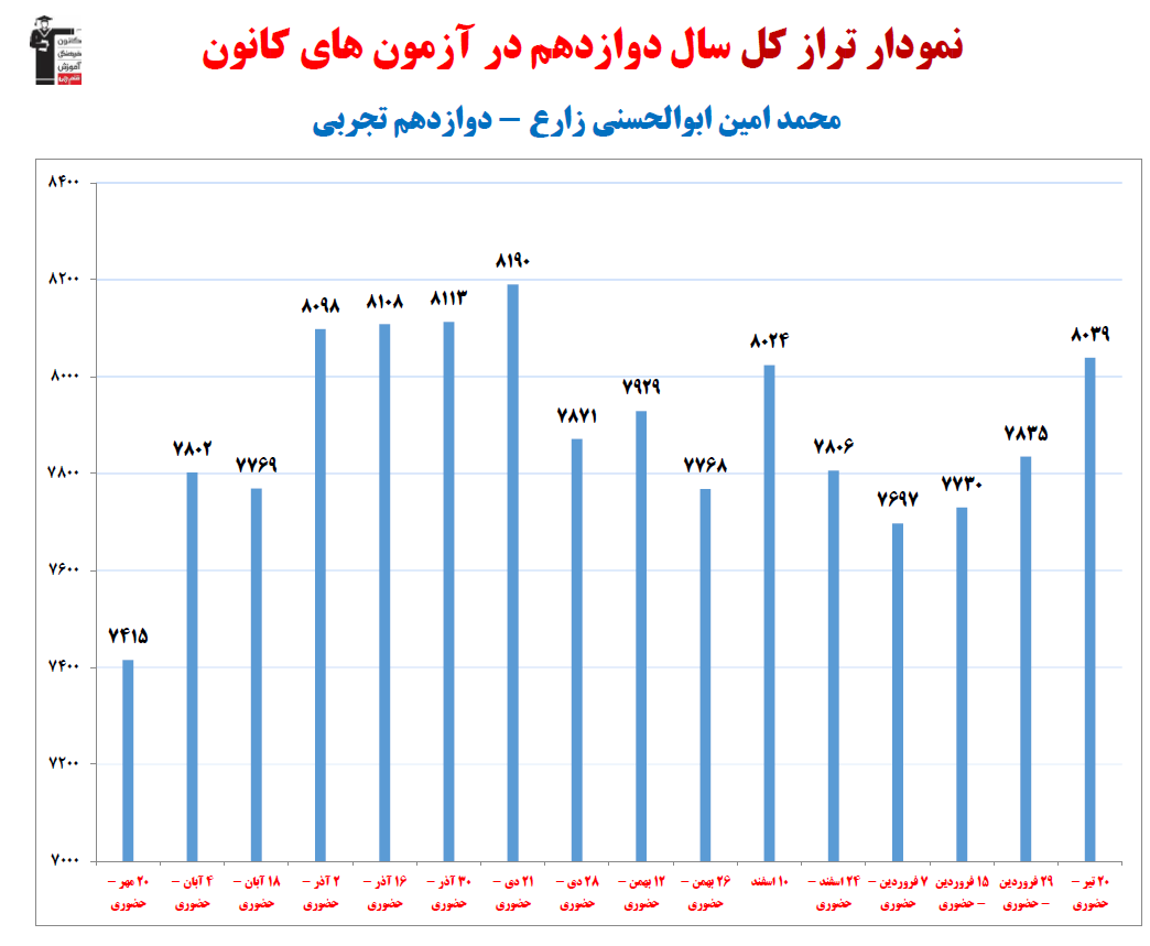 در ادامه میتوانید عملکرد درسی محمدامين ابوالحسنی زارع را در کانون مشاهده کنید.نمودار پیشرفت میانگین تراز در پایههای مختلف، نمودار تراز کل، عملکرد آزمونهای سال دوازدهم، کارنامههای مبحثی در نمودارها و تصاویر زیر قابل مشاهده است.