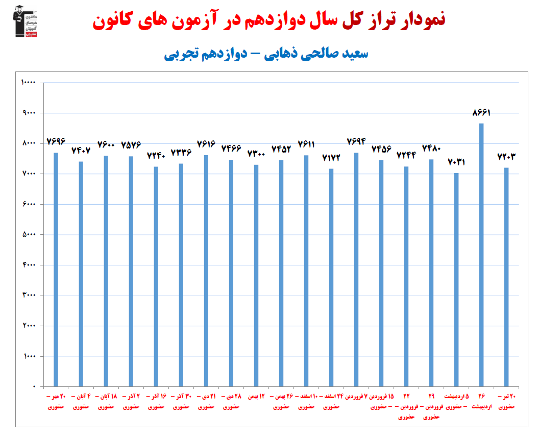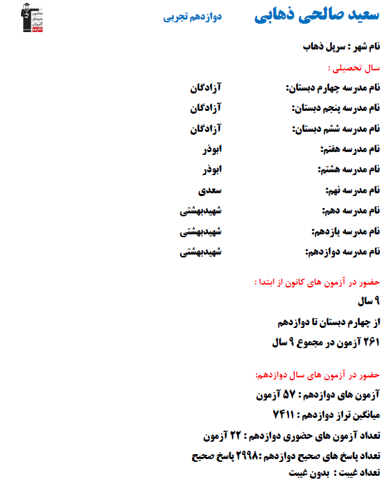 در ادامه میتوانید عملکرد درسی سعيد صالحي ذهابي را در کانون مشاهده کنید.نمودار پیشرفت میانگین تراز در پایههای مختلف، نمودار تراز کل، عملکرد آزمونهای سال دوازدهم و شروع از تابستان و تراز آزمون های تابستان، کارنامههای مبحثی در نمودارها و تصاویر زیر قابل مشاهده است.