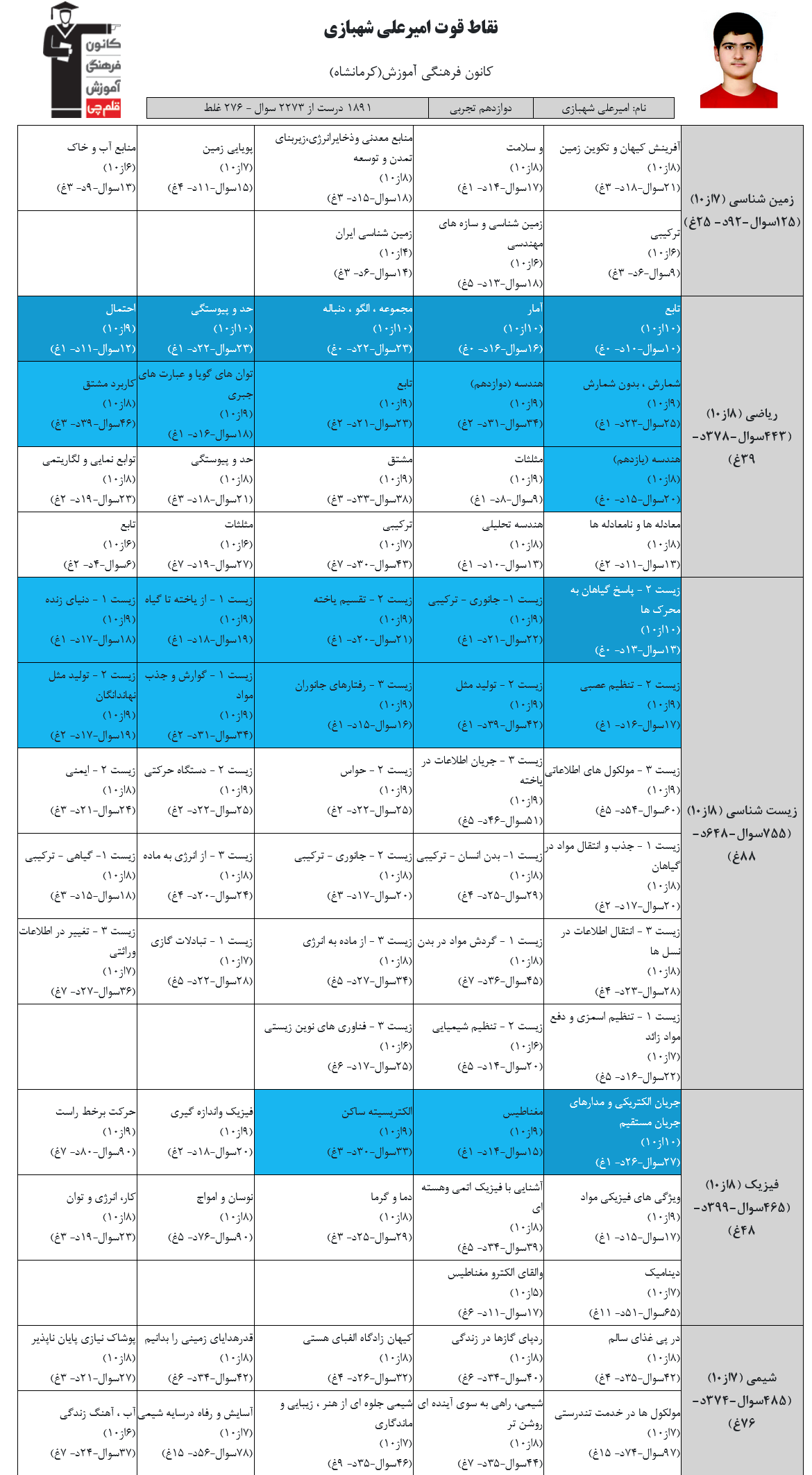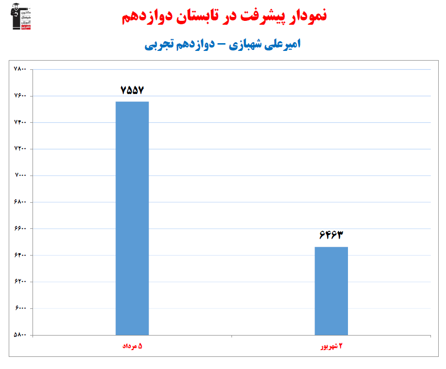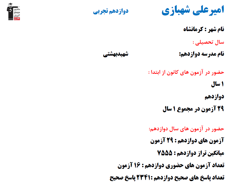 در ادامه میتوانید عملکرد درسی اميرعلي شهبازی را در کانون مشاهده کنید. نمودار تراز کل، عملکرد آزمونهای سال دوازدهم و شروع از تابستان و تراز آزمون های تابستان، کارنامههای مبحثی در نمودارها و تصاویر زیر قابل مشاهده است.