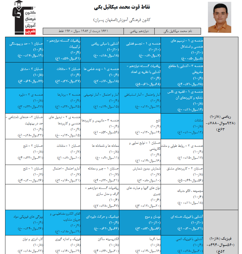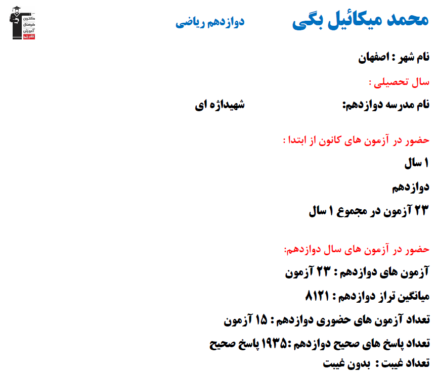 در ادامه میتوانید عملکرد درسی محمد ميکائيل بگي را در کانون مشاهده کنید.عملکرد آزمونهای سال دوازدهم و کارنامههای مبحثی در نمودارها و تصاویر زیر قابل مشاهده است.