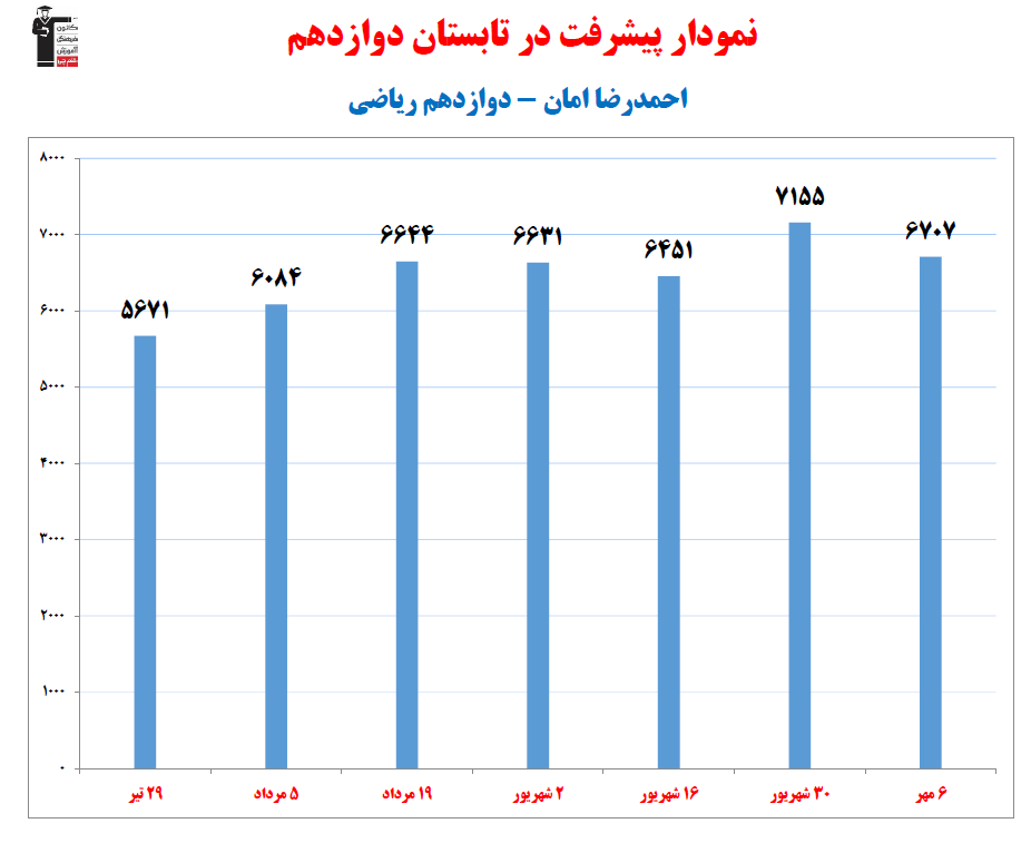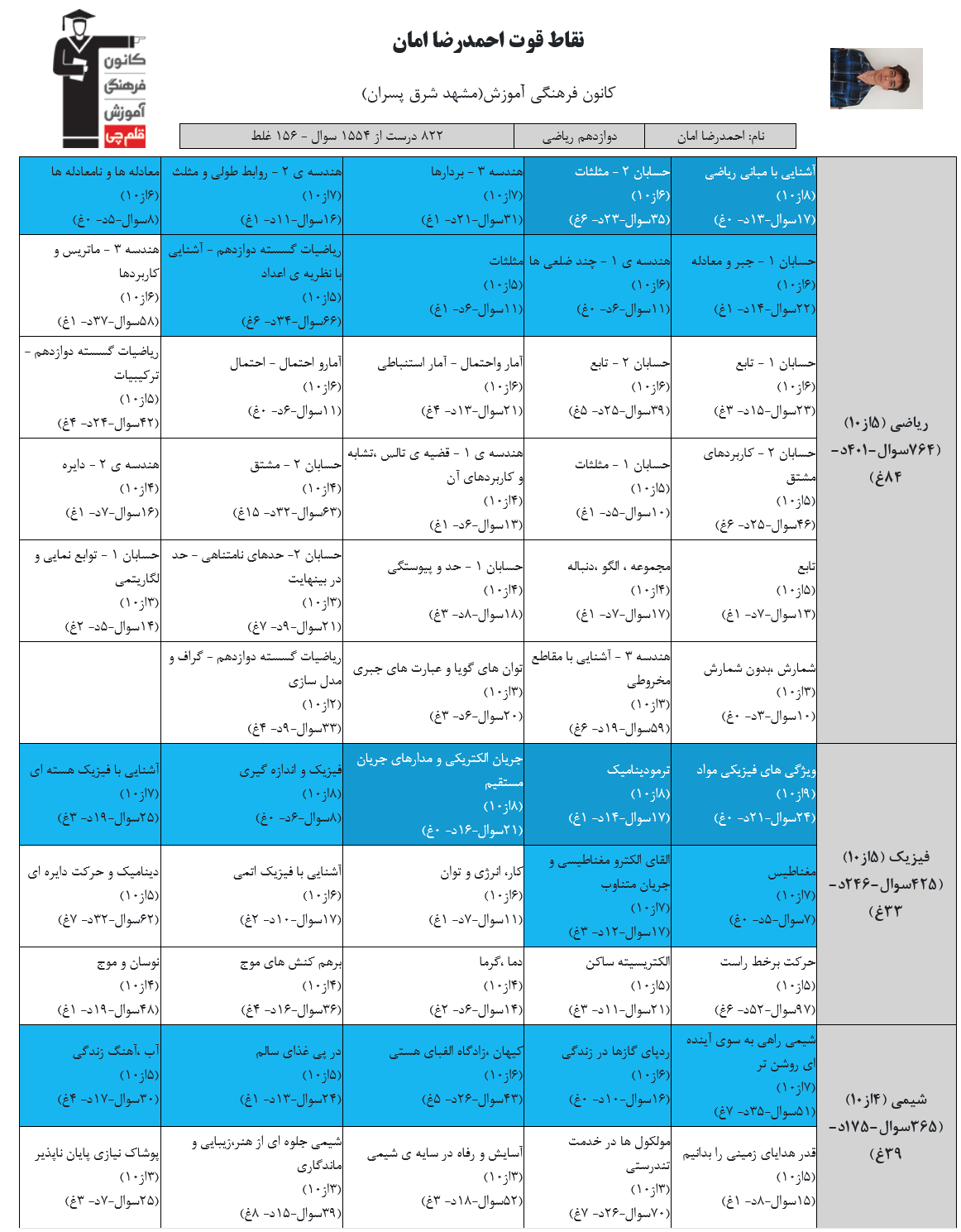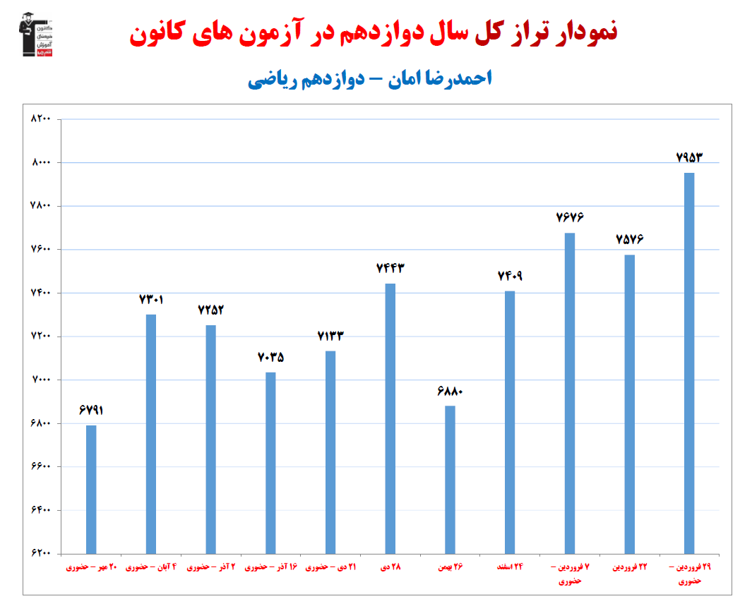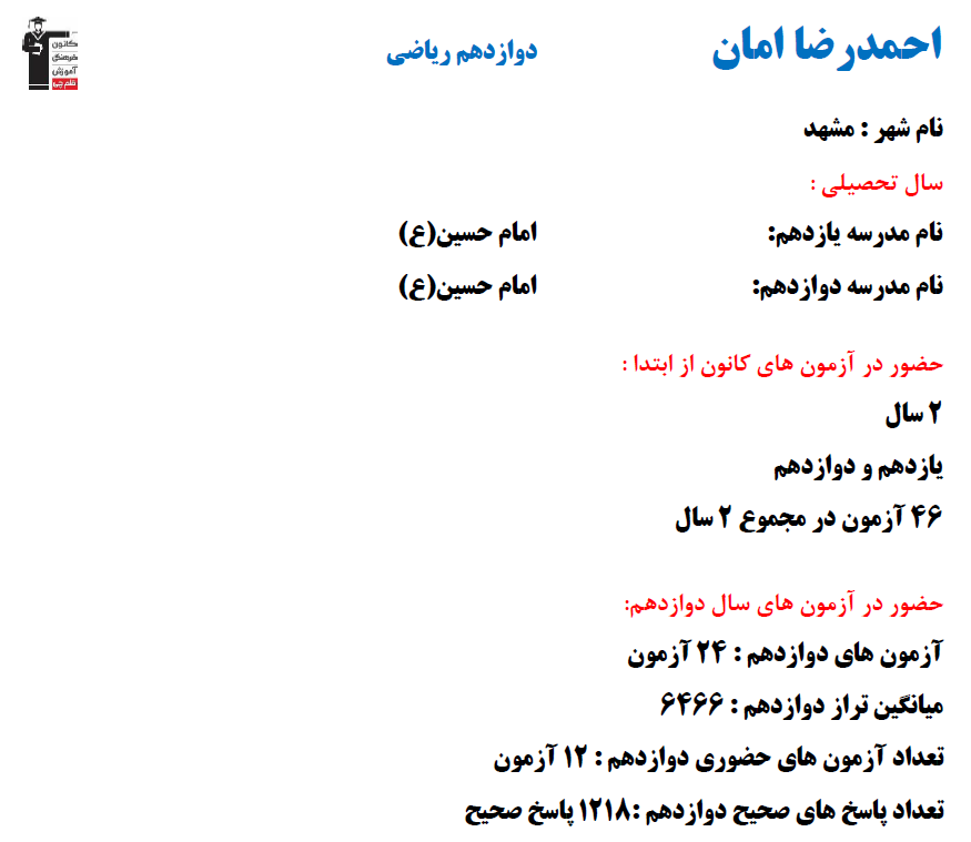 در ادامه میتوانید عملکرد درسی احمدرضا امان را در کانون مشاهده کنید.نمودار پیشرفت میانگین تراز در پایههای مختلف، نمودار تراز کل، عملکرد آزمونهای سال دوازدهم و شروع از تابستان و تراز آزمون های تابستان، کارنامههای مبحثی در نمودارها و تصاویر زیر قابل مشاهده است.