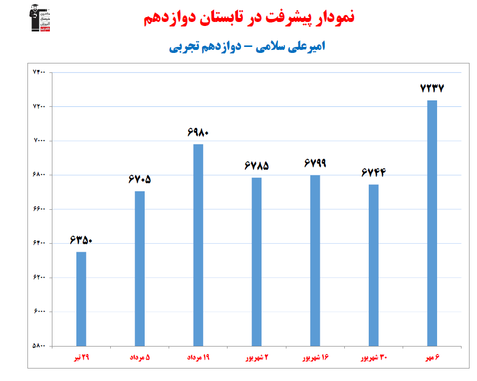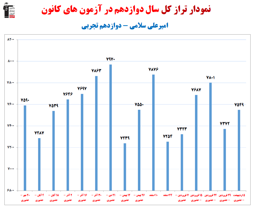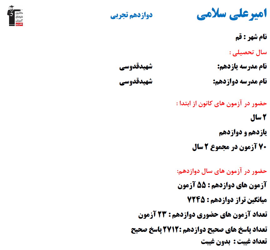 در ادامه میتوانید عملکرد درسی امیرعلي سلامي را در کانون مشاهده کنید.نمودار پیشرفت میانگین تراز در پایههای مختلف، نمودار تراز کل، عملکرد آزمونهای سال دوازدهم و شروع از تابستان و تراز آزمون های تابستان، کارنامههای مبحثی در نمودارها و تصاویر زیر قابل مشاهده است.