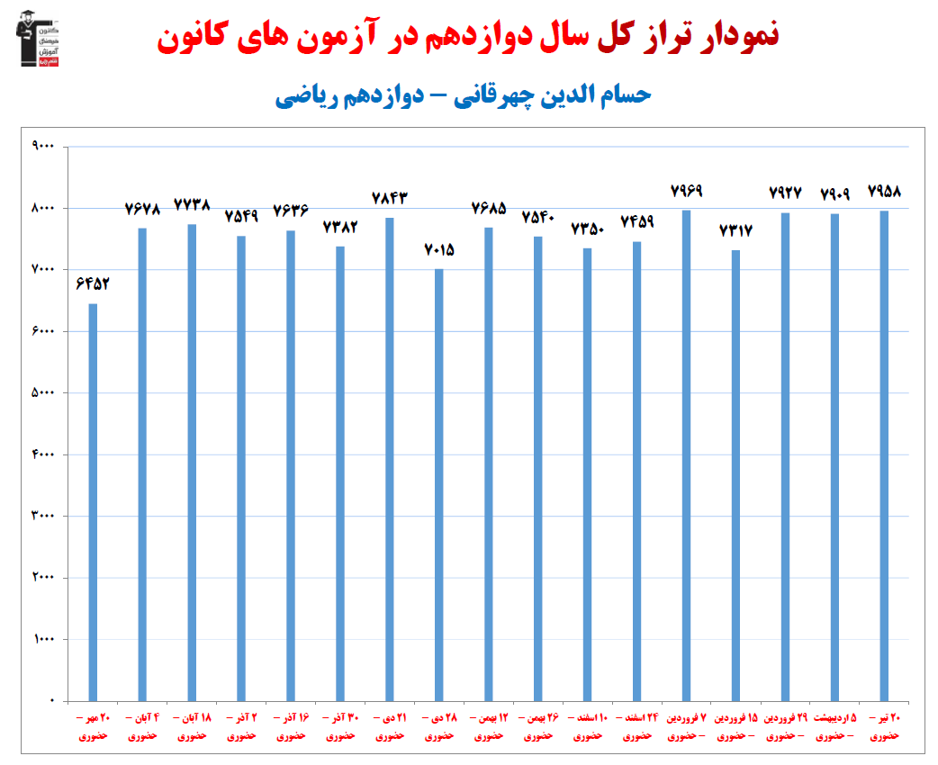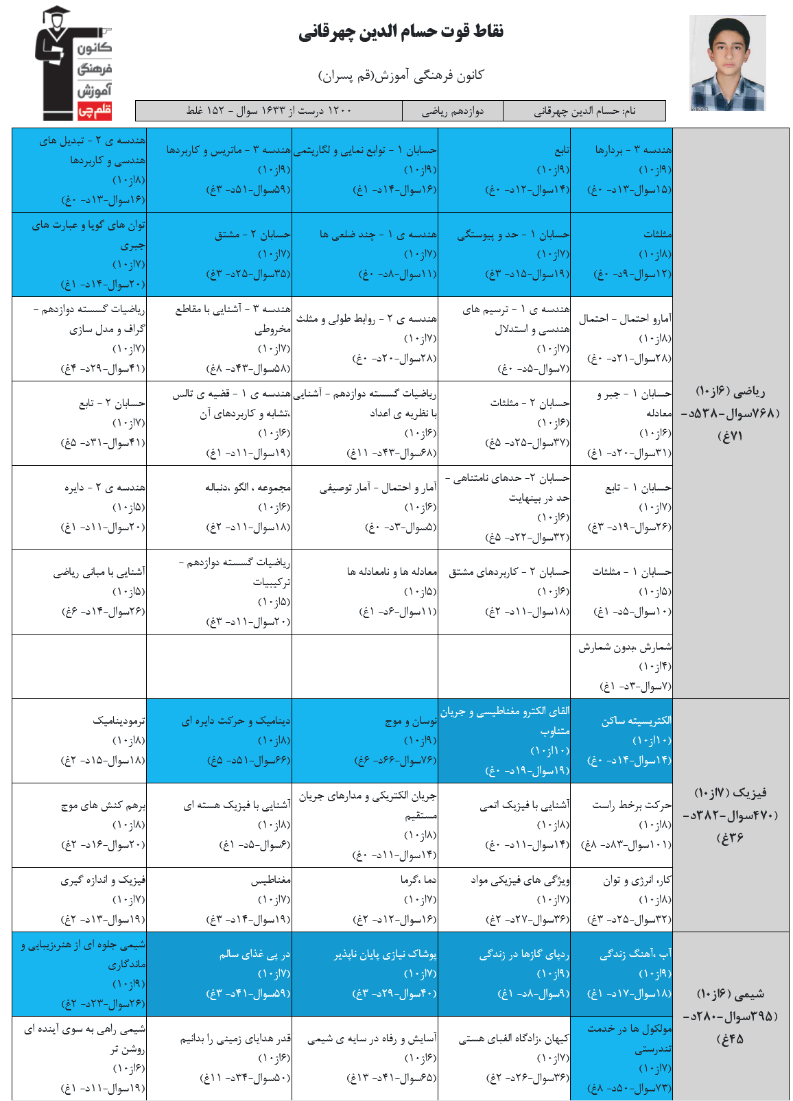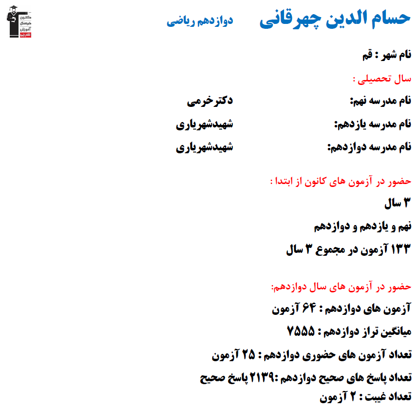 در ادامه میتوانید عملکرد درسی حسام الدين چهرقانی را در کانون مشاهده کنید.نمودار پیشرفت میانگین تراز در پایههای مختلف، نمودار تراز کل، عملکرد آزمونهای سال دوازدهم و کارنامههای مبحثی در نمودارها و تصاویر زیر قابل مشاهده است.