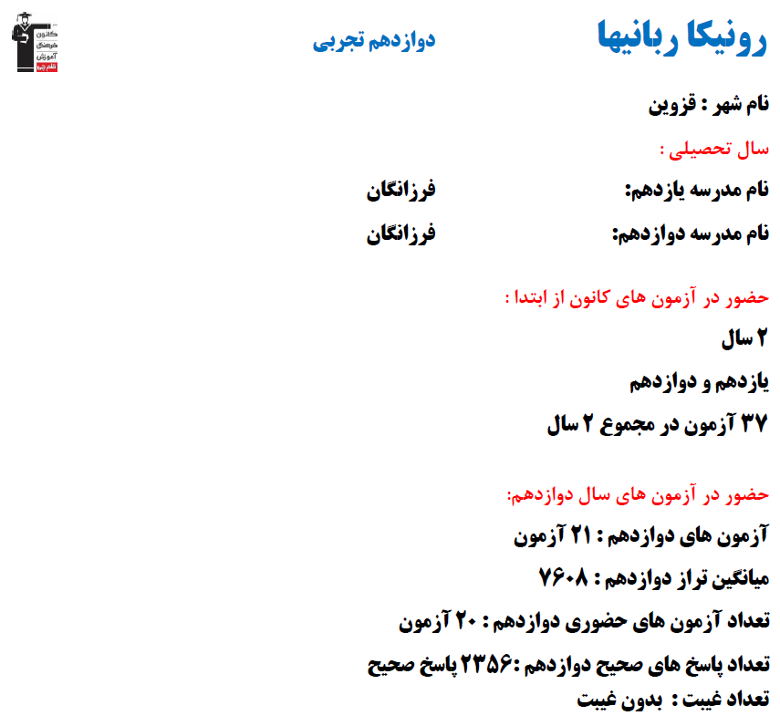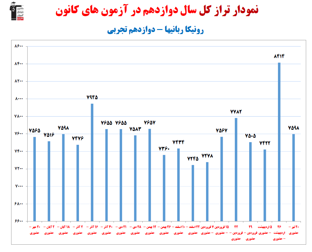 در ادامه میتوانید عملکرد درسی رونيکا ربانيها را در کانون مشاهده کنید.نمودار پیشرفت میانگین تراز در پایههای مختلف، نمودار تراز کل، عملکرد آزمونهای سال دوازدهم و کارنامههای مبحثی در نمودارها و تصاویر زیر قابل مشاهده است.