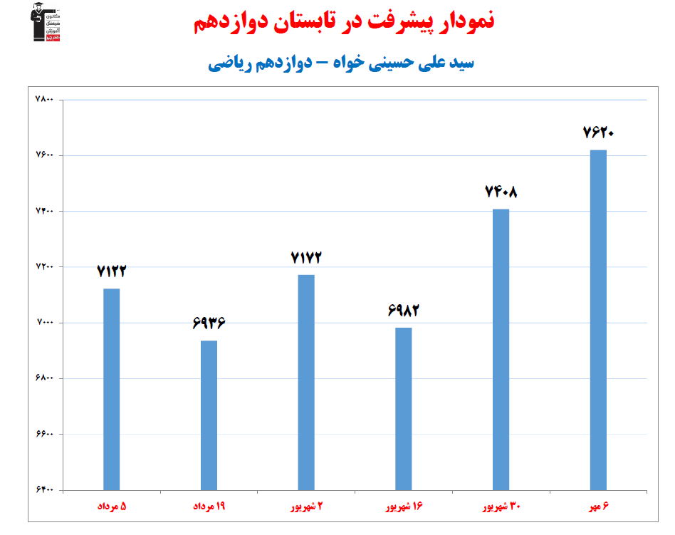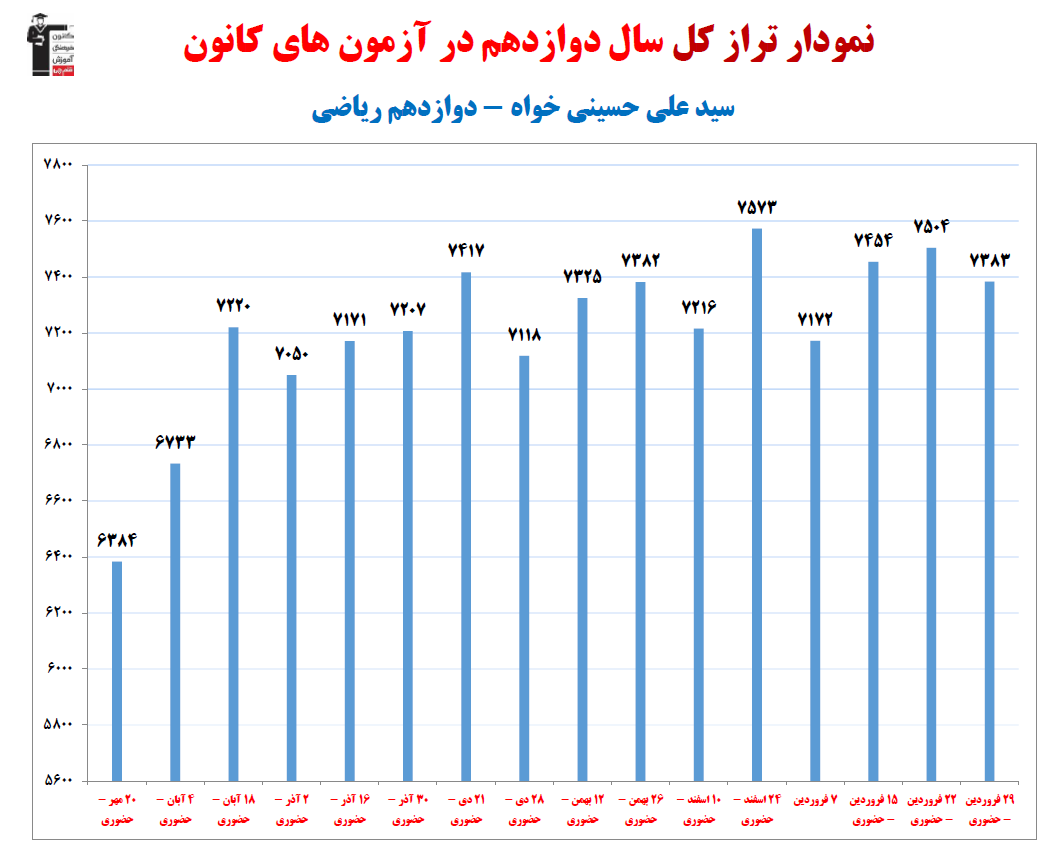 در ادامه میتوانید عملکرد درسی سيد علي حسيني خواه را در کانون مشاهده کنید.نمودار پیشرفت میانگین تراز در پایههای مختلف، نمودار تراز کل، عملکرد آزمونهای سال دوازدهم و شروع از تابستان و تراز آزمون های تابستان، کارنامههای مبحثی در نمودارها و تصاویر زیر قابل مشاهده است.