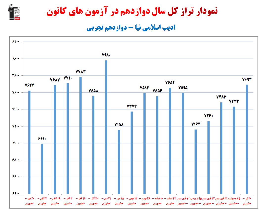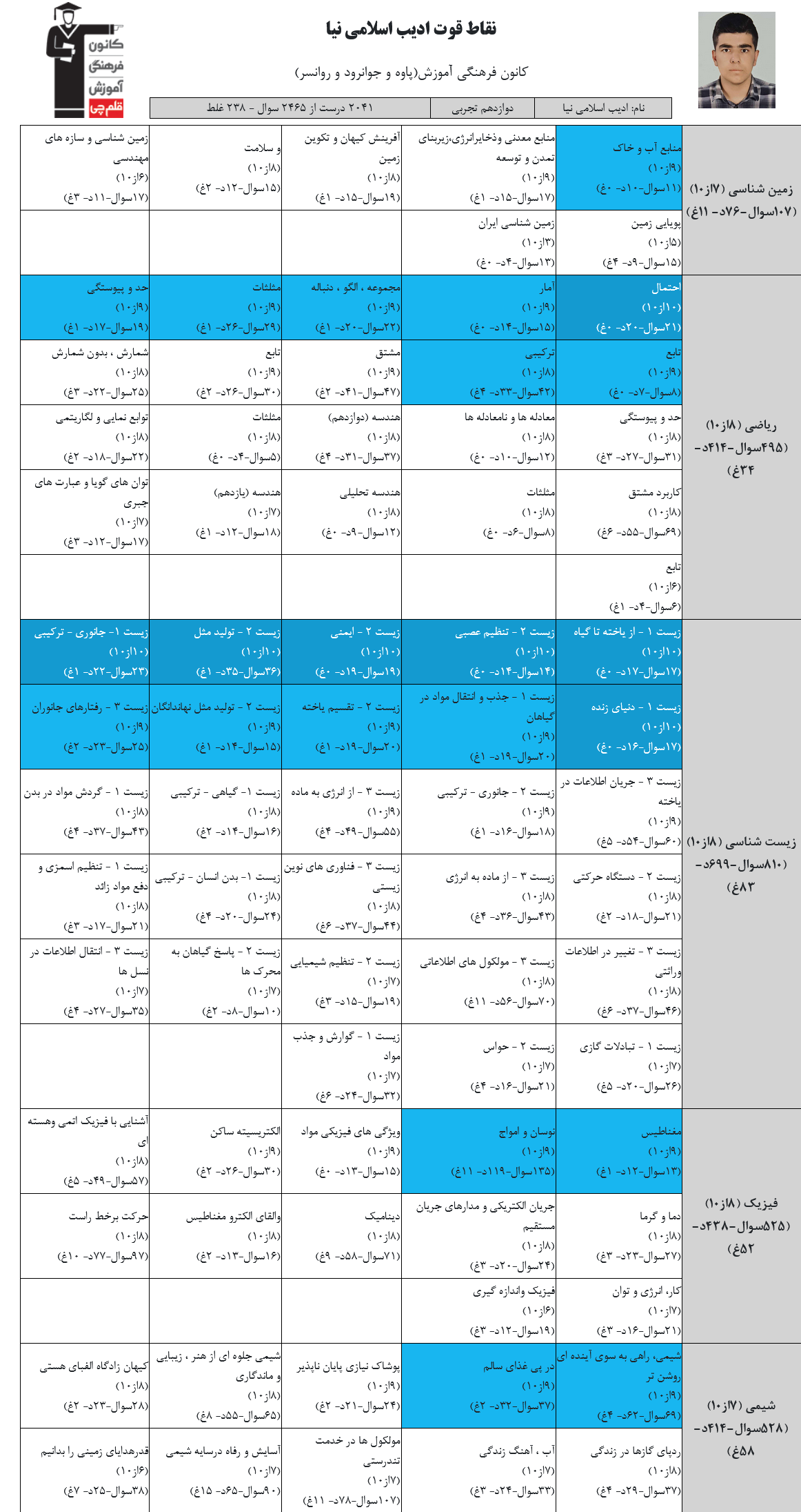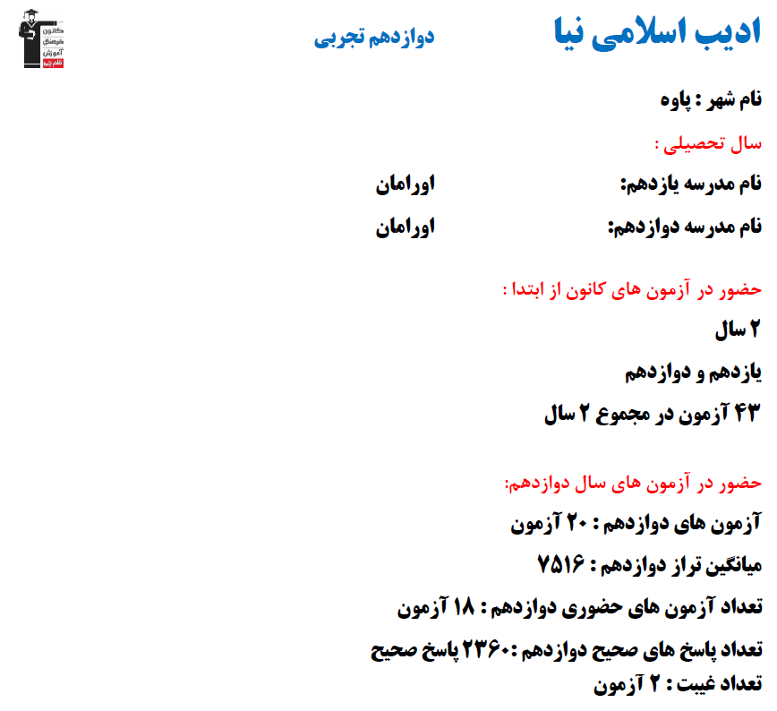 در ادامه میتوانید عملکرد درسی اديب اسلامي نيا را در کانون مشاهده کنید.نمودار پیشرفت میانگین تراز در پایههای مختلف، نمودار تراز کل، عملکرد آزمونهای سال دوازدهم و کارنامههای مبحثی در نمودارها و تصاویر زیر قابل مشاهده است.