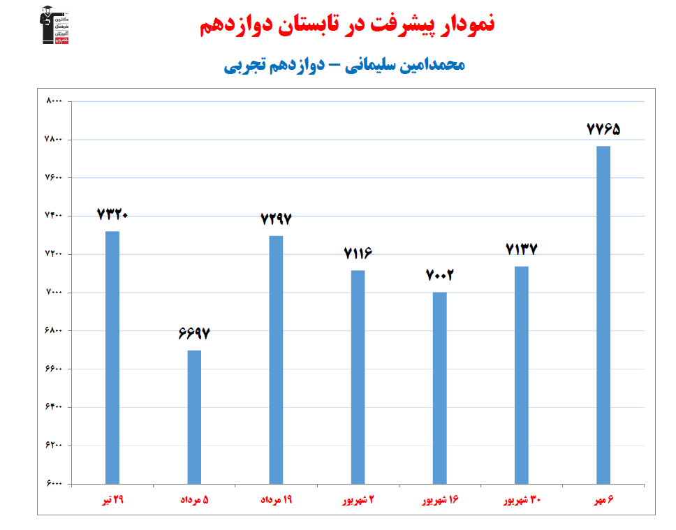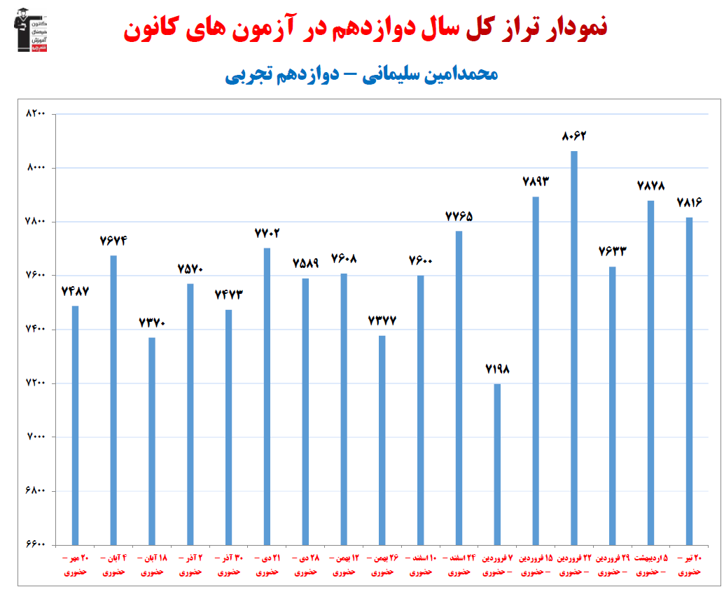 در ادامه میتوانید عملکرد درسی محمدامين سليماني را در کانون مشاهده کنید.نمودار پیشرفت میانگین تراز در پایههای مختلف، نمودار تراز کل، عملکرد آزمونهای سال دوازدهم و شروع از تابستان و تراز آزمون های تابستان، کارنامههای مبحثی در نمودارها و تصاویر زیر قابل مشاهده است.