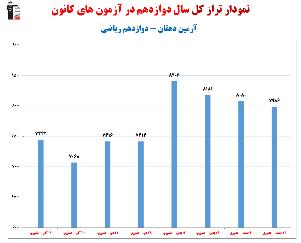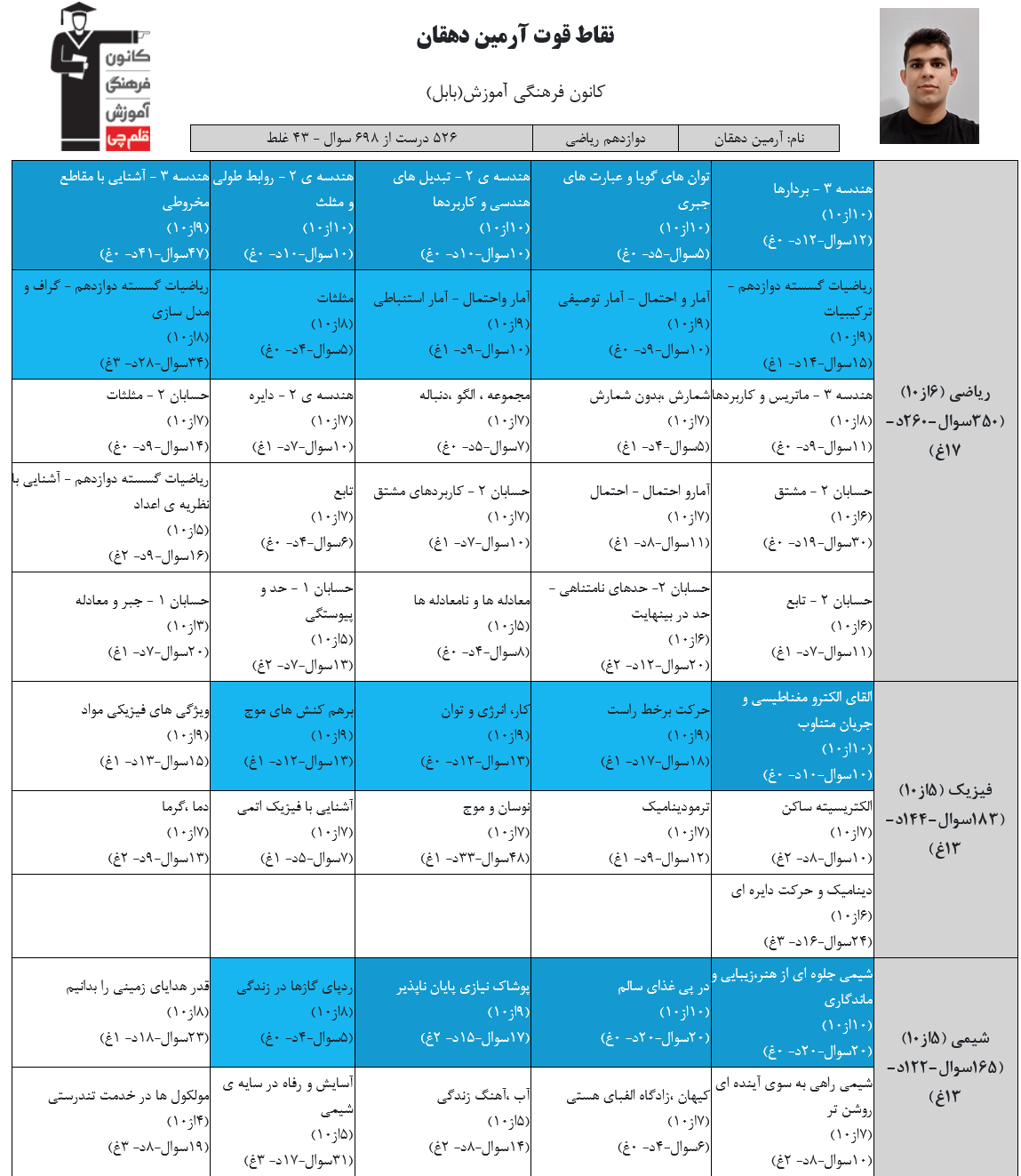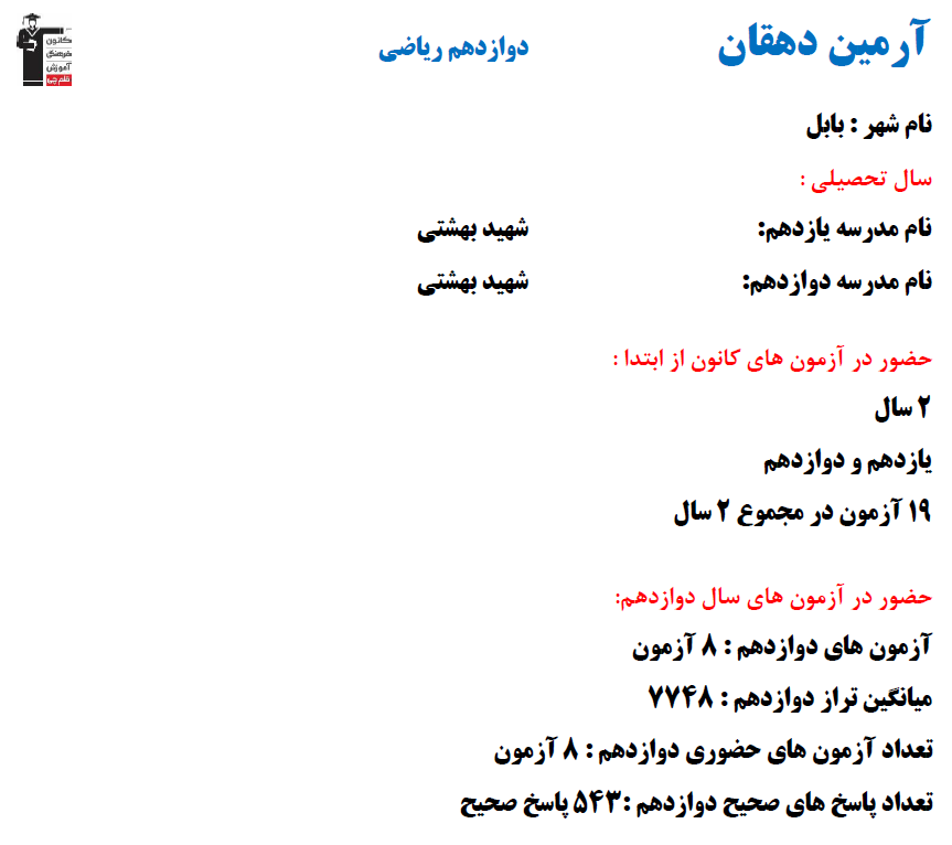 در ادامه میتوانید عملکرد درسی آرمين دهقان را در کانون مشاهده کنید.نمودار پیشرفت میانگین تراز در پایههای مختلف، نمودار تراز کل، عملکرد آزمونهای سال دوازدهم و شروع از تابستان و تراز آزمون های تابستان، کارنامههای مبحثی در نمودارها و تصاویر زیر قابل مشاهده است.