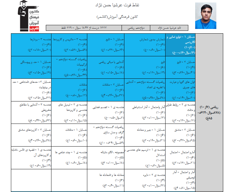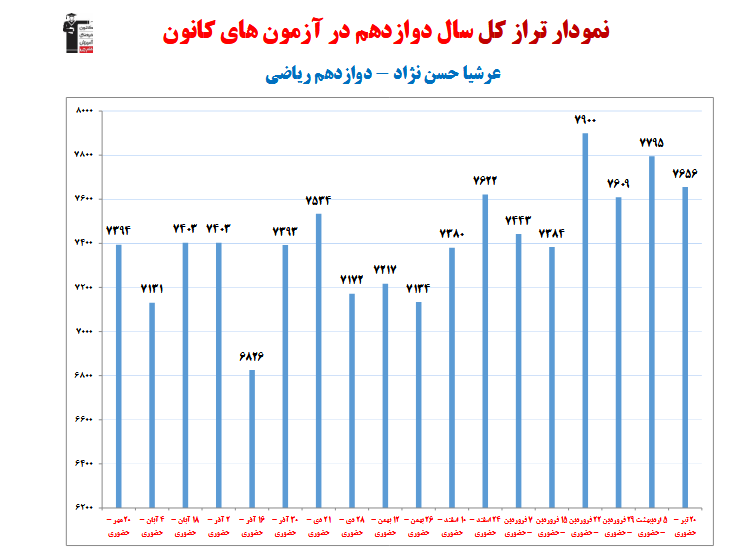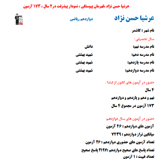 در ادامه میتوانید عملکرد درسی عرشیا حسن نژاد را در کانون مشاهده کنید.نمودار پیشرفت میانگین تراز در پایههای مختلف، نمودار تراز کل، عملکرد آزمونهای سال دوازدهم و شروع از تابستان و تراز آزمون های تابستان، کارنامههای مبحثی در نمودارها و تصاویر زیر قابل مشاهده است.
